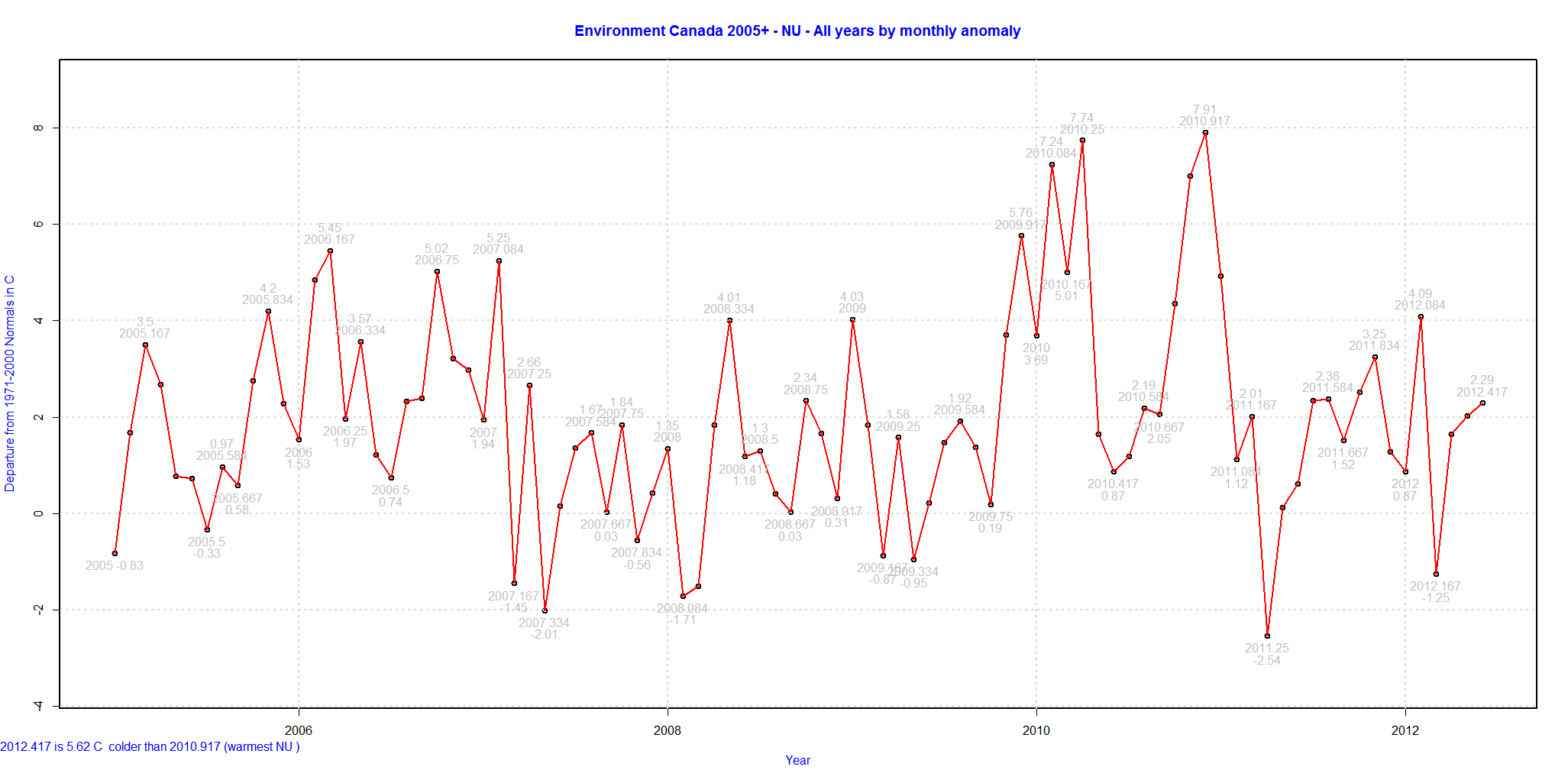 Using Environment Canada monthly data for stations with calculated 1971-2000 normals, there are the monthly anomalies for Nunavut.