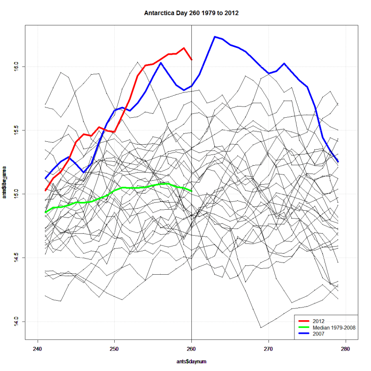 Antarctic Sea Ice area is still at a record amount for day 260. Using the data from Cryosphere I have graphed the record breaking Antarctic Sea Ice data.