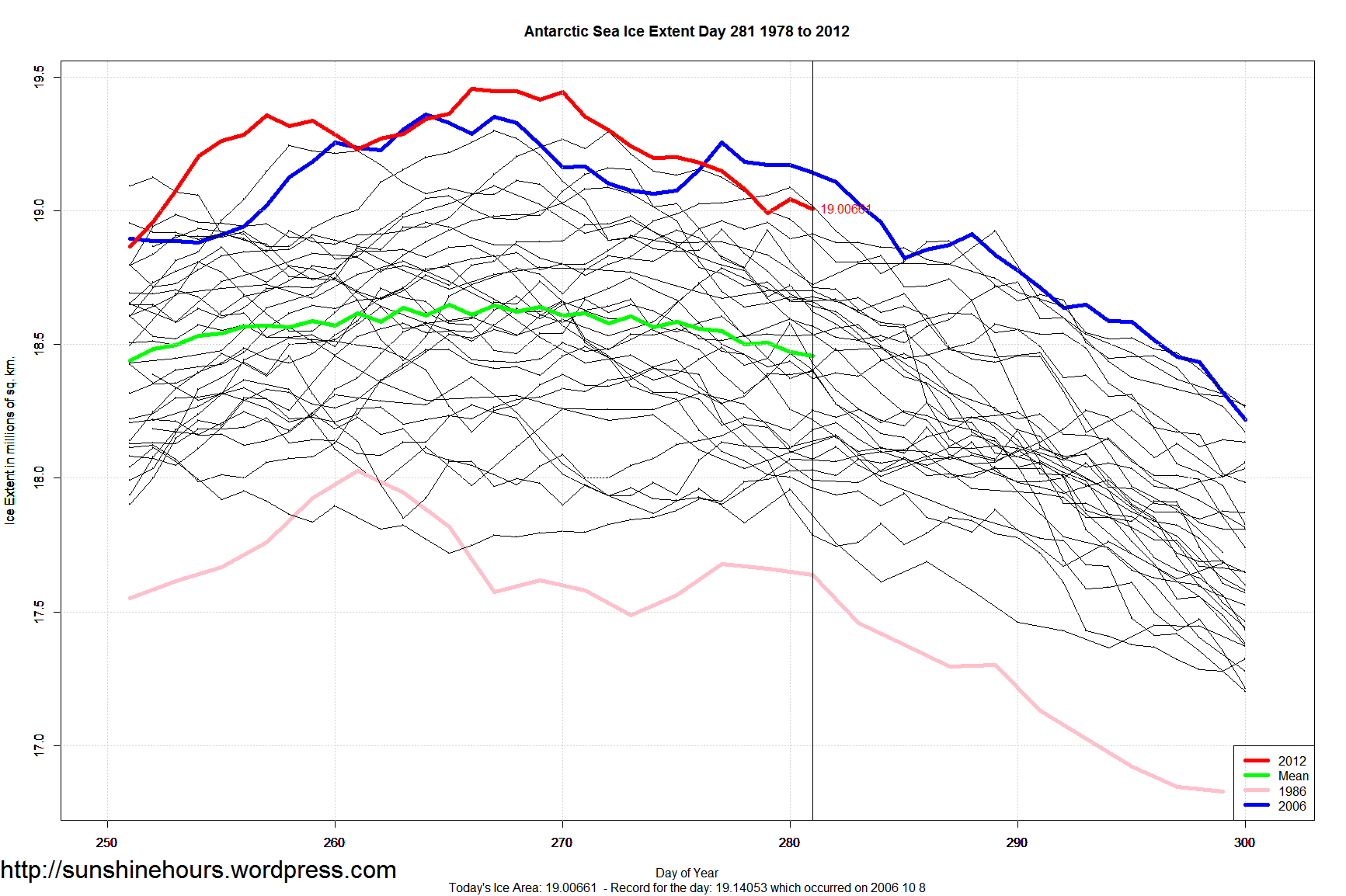 Only 9 years in the satellite era have seen Antarctic Sea Ice Extent hit 19 million sq km. 2006 had 30 days. In the last 2 days 2012 has trend up again over 19 million and put it within 2 days of tying the all time record. Aside from 1980, all of those years have been since 1998 which some people claim have been the hottest years in the history of human beings. Antarctic Sea Ice Extent disagrees.