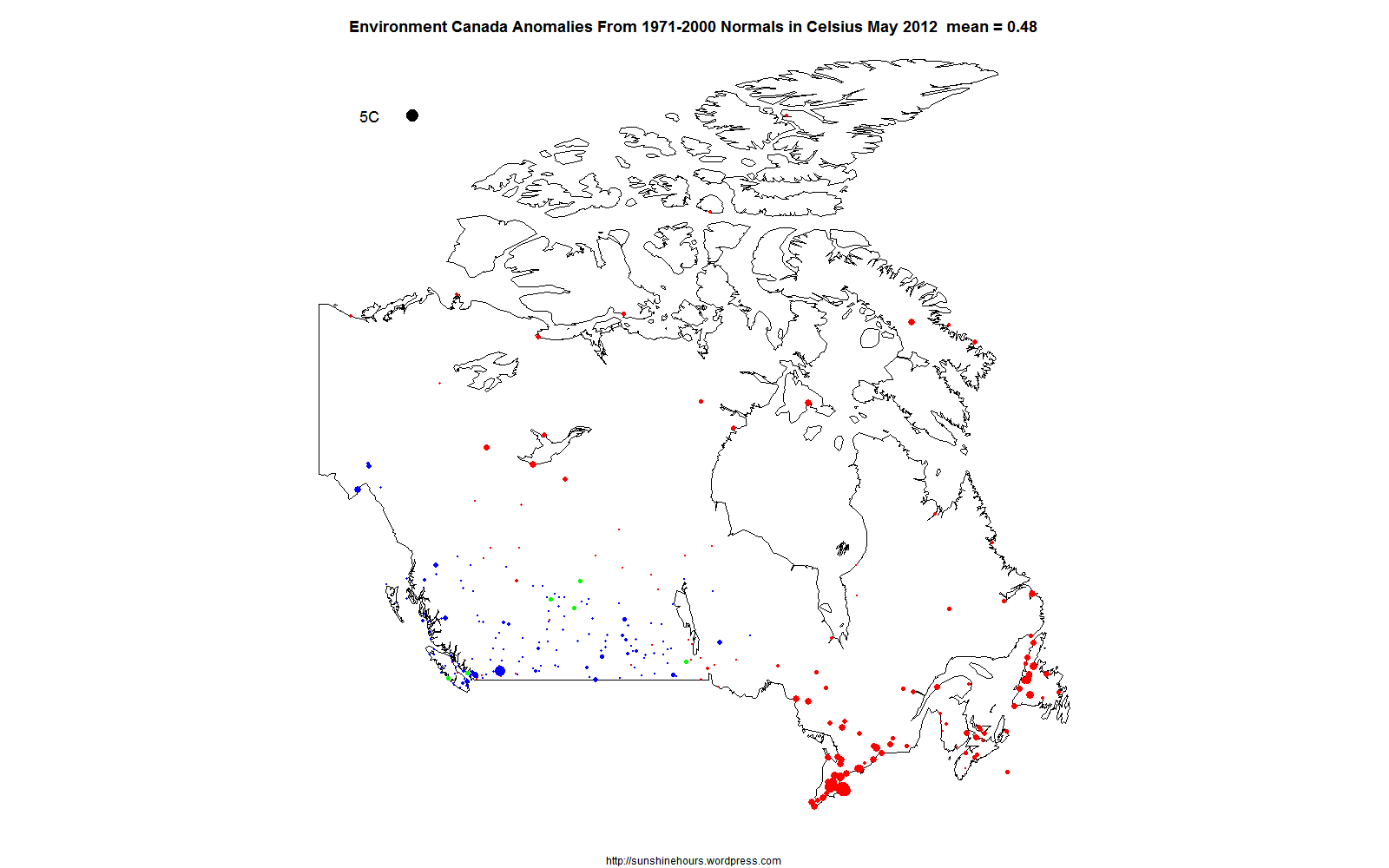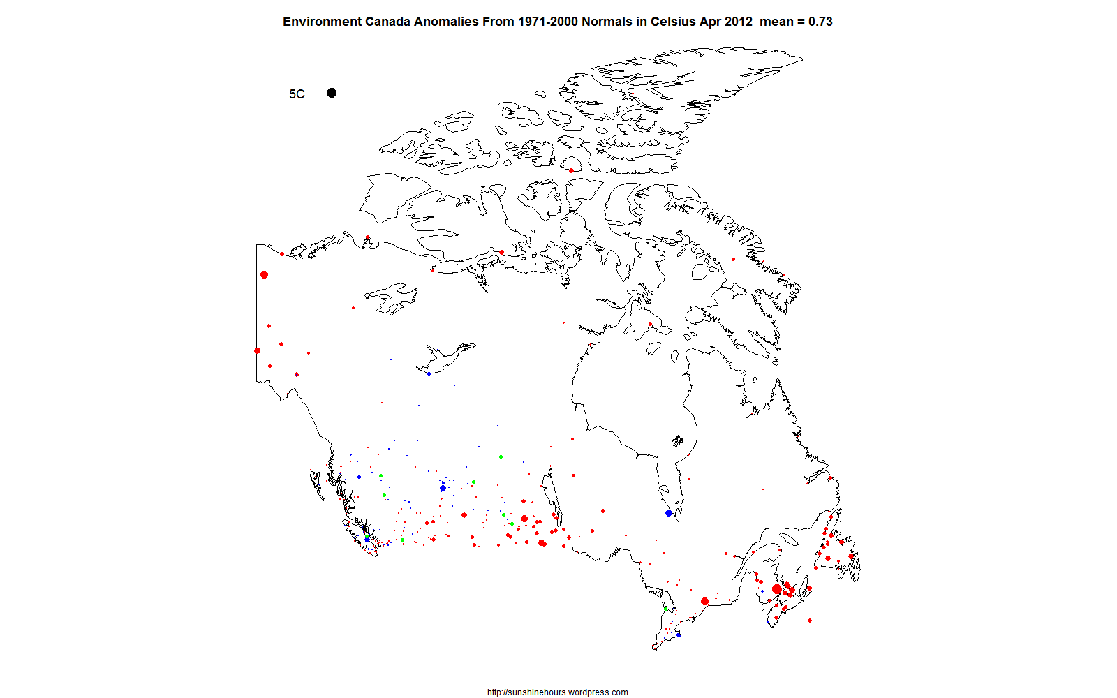The 5C black dot in the top left hand corner represents 5C difference from “normal”. Red dots are warmer than normal. Blue are cooler. And Green are 0.