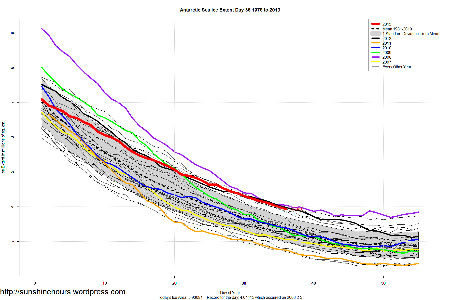 Antarctic Sea Ice Almost Set Some Records Published on February 6, 2013 by sunshinehours1 Antarctic Sea Ice almost almost set some records and averaged the 2nd or 3rd most ice at this time of year ever over the last week. Almost a record is definitive proof of the end of days … isn’t it? Share this: Click to share on X (Opens in new window) X Click to share on Facebook (Opens in new window) Facebook Like Loading... Related