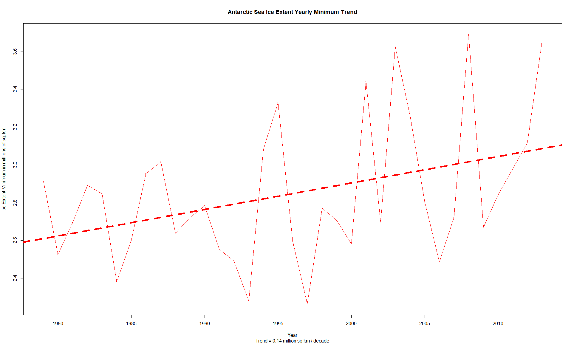 Antarctic Sea Ice Minimum Trend is climbing at 140,000 sq km per decade!