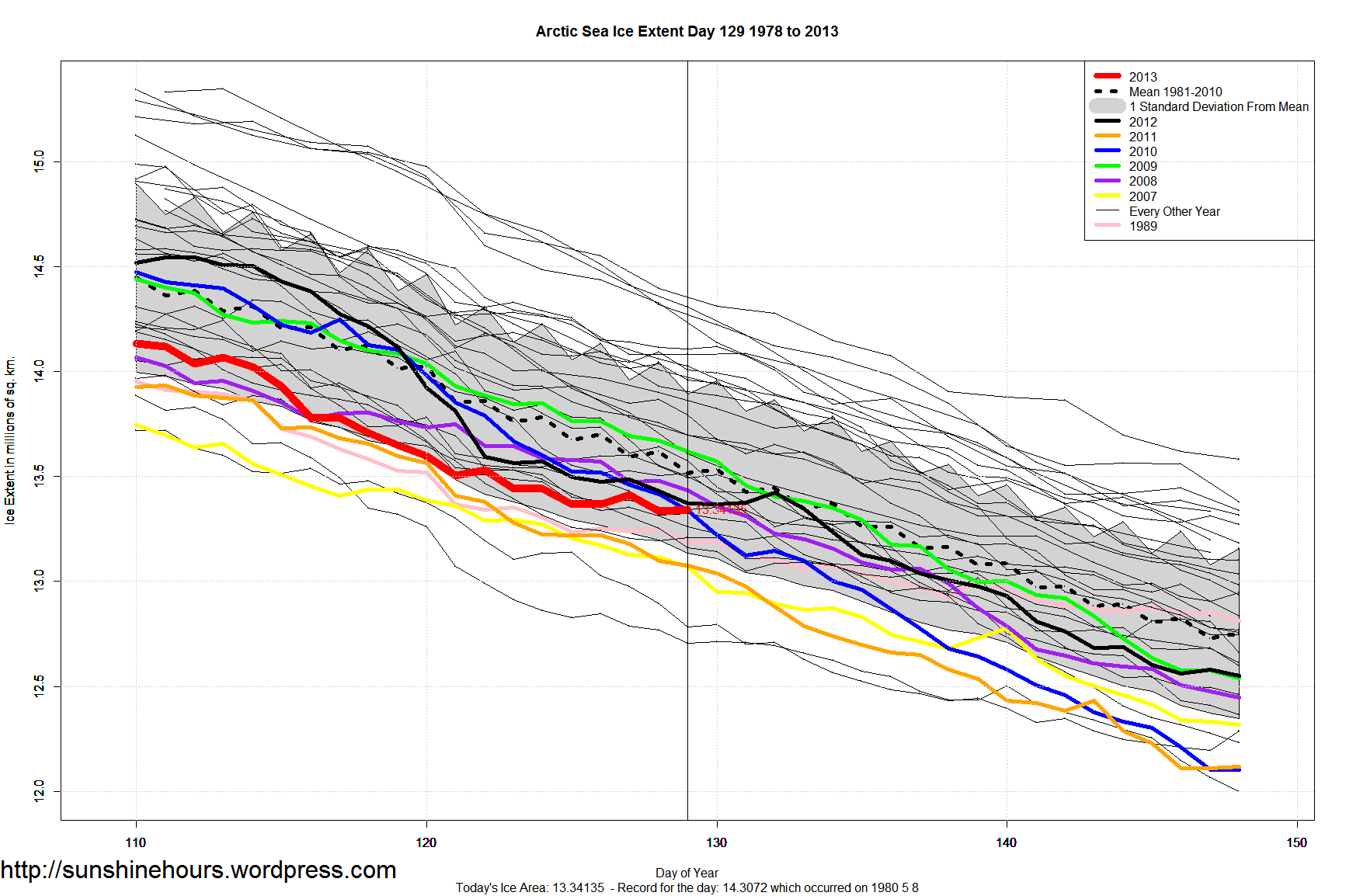 If Arctic Sea Ice Is In A Death Spiral Why is 2013 The 12th Lowest And Not The Lowest? Published on May 10, 2013 by sunshinehours1 What a strange death spiral for Arctic Sea Ice. There are 11 years with less ice at this day in the year: 2006, 2004, 2007, 2011, 2003, 1989, 2005, 2002, 1996, 2010 and 1995. Click for bigger. Share this: Click to share on X (Opens in new window) X Click to share on Facebook (Opens in new window) Facebook Like Loading... Related