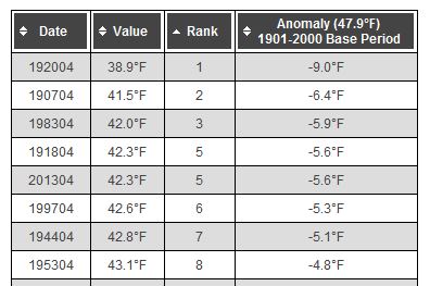 After looking at the national ranking (23rd coldest) it is time to look at the State data: