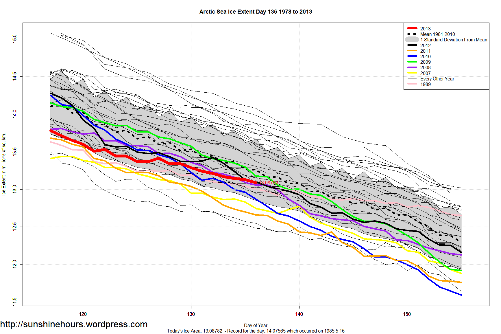 Arctic Sea Ice Extent is 13.09 million sq km on day 136.
