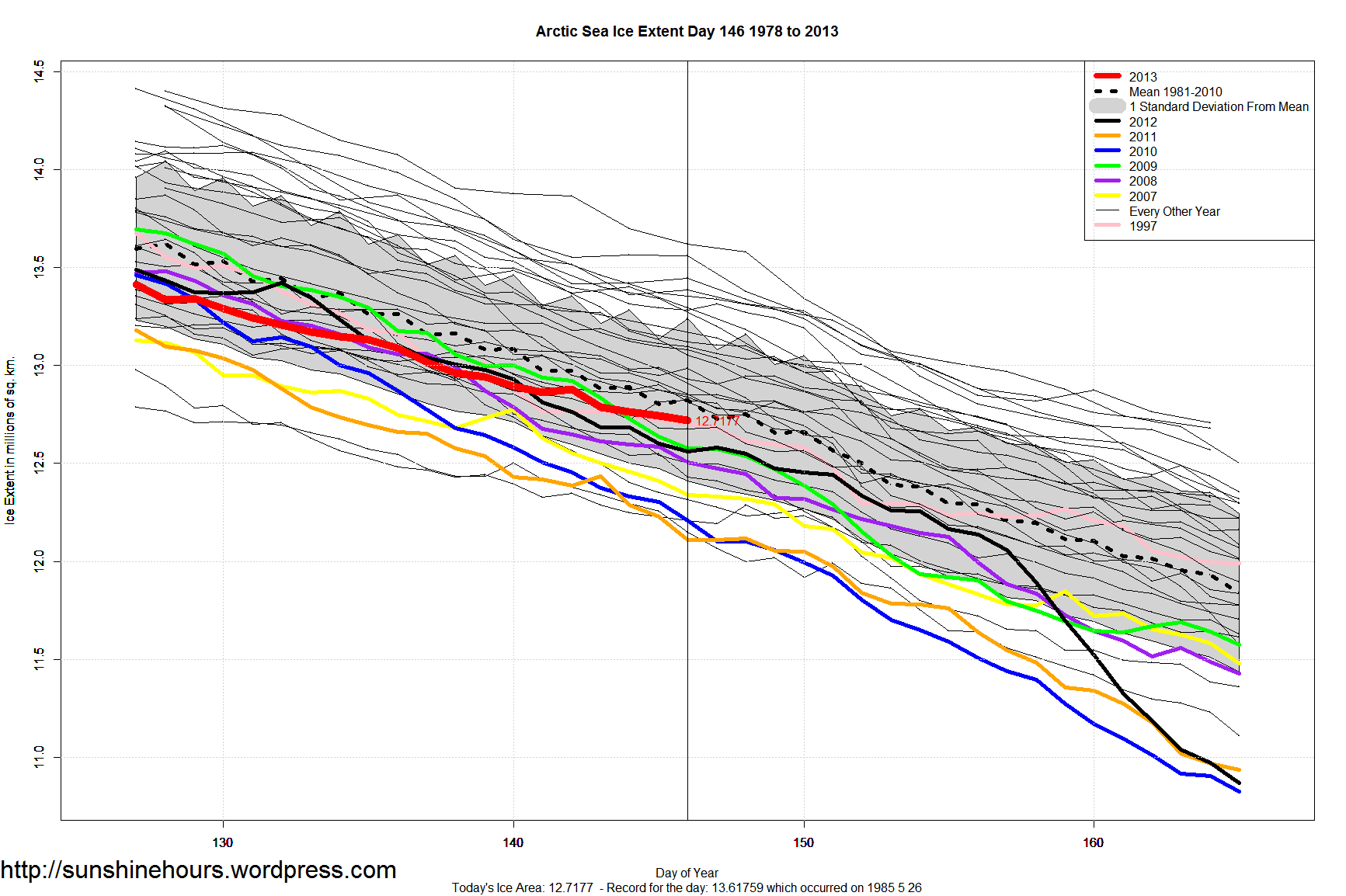 This site may not be worried about climate change, but at least post on something meaningful. It is not even June yet. The issue is not springtime ice cover. The vital issue for climate change impacts in the Arctic by sea ice change is its extent after the summer melt season is done in September. Last year was the lowest ever and until a few weeks ago this year’s trend was even lower than that – and was still meaningless. You have selected a time of year for your snipe, as though late May data are useful markers for long term trends. They are next to useless.