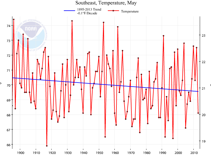Just a reminder for those AGW cult members. According to the NOAA, May in the Southeast USA has been cooling at -0.1F/decade since 1895.