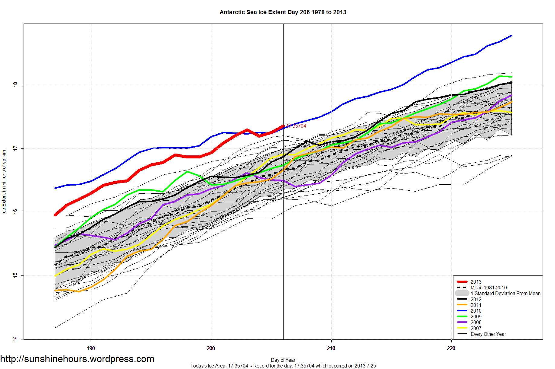 3rd Daily Record in 4 Days for Antarctic Sea Ice Extent Published on July 26, 2013July 26, 2013 by sunshinehours1 July 26 (Day 206) saw the 3rd Daily Record in 4 Days for Antarctic Sea Ice Extent. Click for bigger. Share this: Share on X (Opens in new window) X Share on Facebook (Opens in new window) Facebook Like Loading... Related
