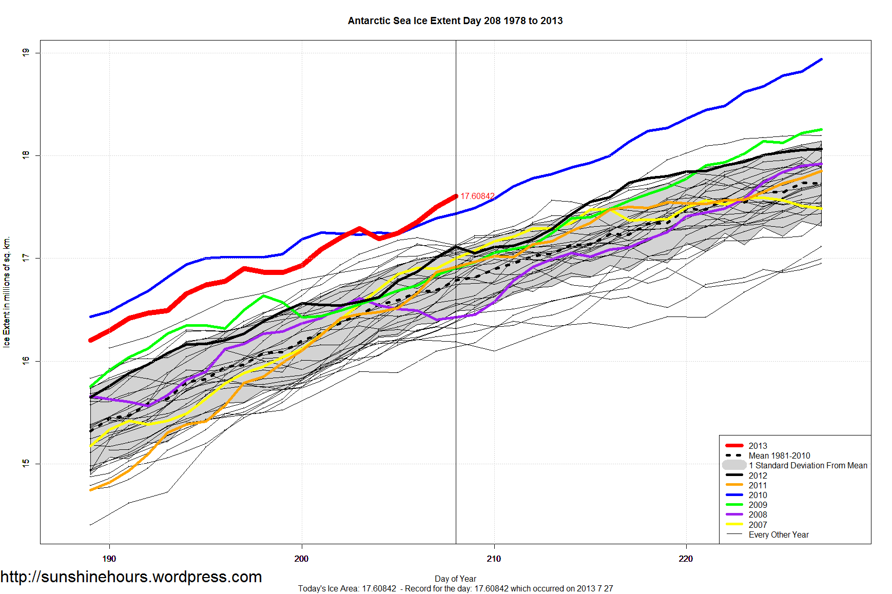 July 27 (Day 208) saw the 5th Daily Record in 6 Days for Antarctic Sea Ice Extent. Click graph for bigger.