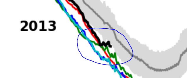 Jaxa is smoother, but it too has slowed. http://www.ijis.iarc.uaf.edu/en/home/seaice_extent.htm And the old DMI is similar. http://ocean.dmi.dk/arctic/old_icecover.uk.php Reply