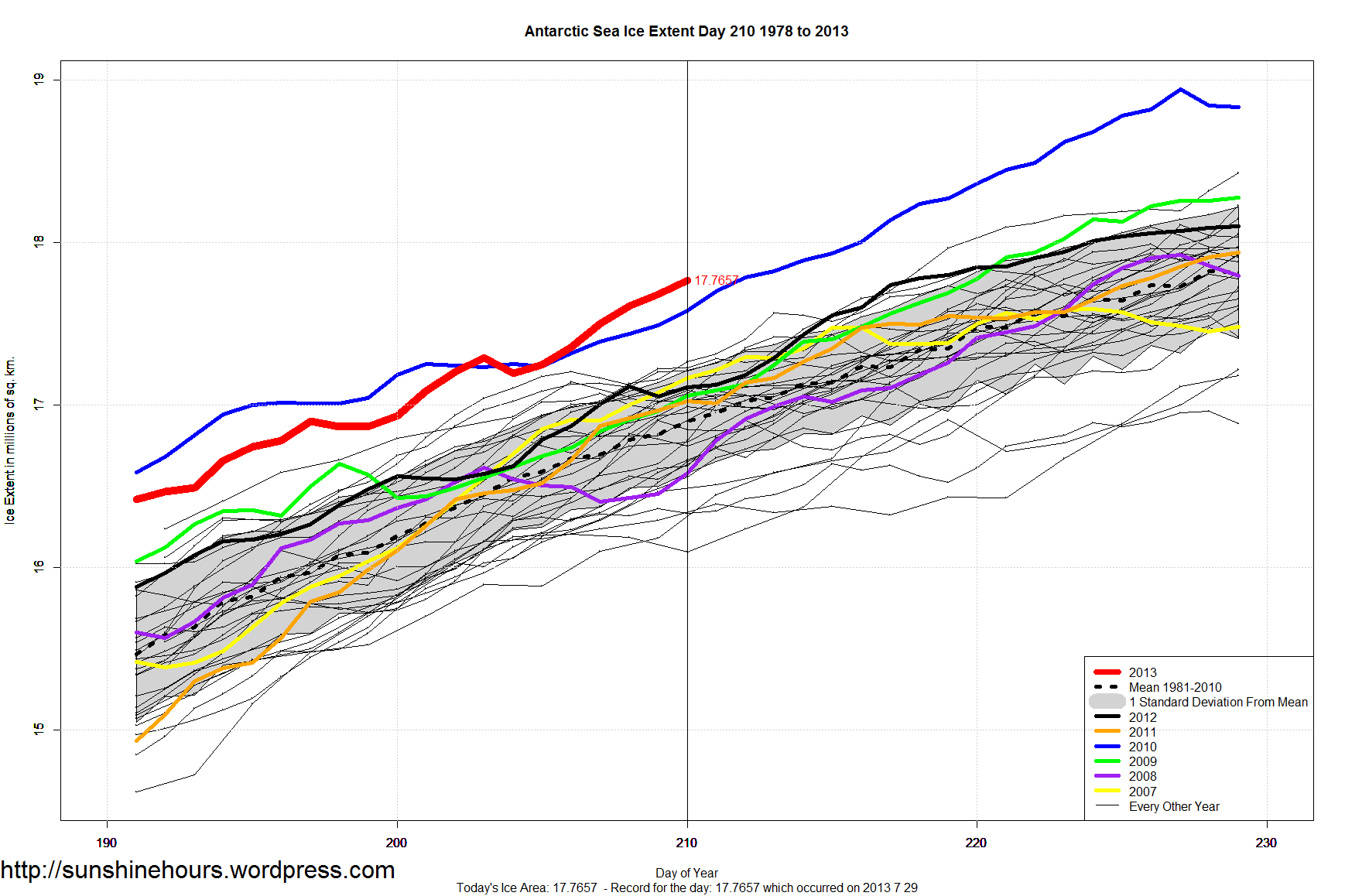 July 29 (Day 210) saw the 7th Daily Record in 8 Days for Antarctic Sea Ice Extent. Click graph for bigger. Data is here.