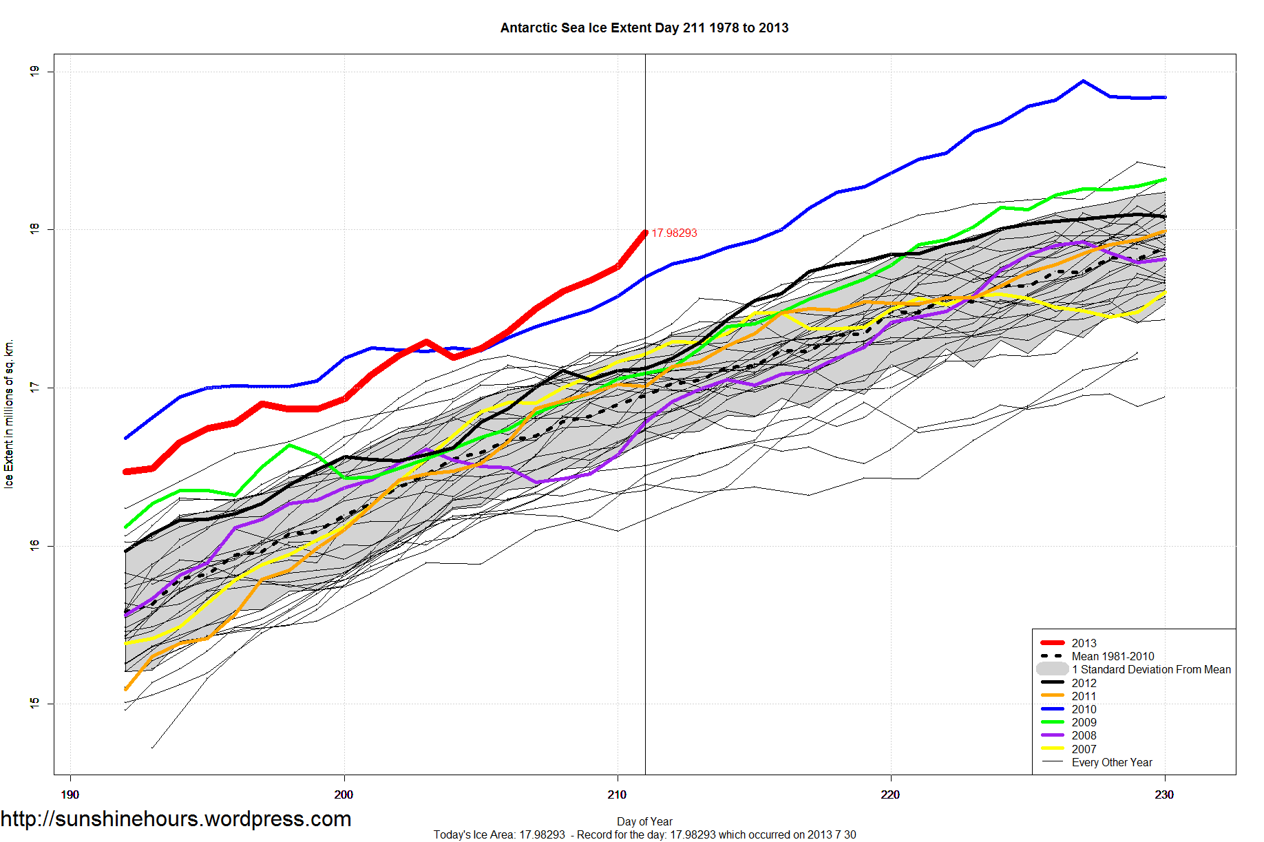 July 30 (Day 211) saw the 8th Daily Record in 9 Days for Antarctic Sea Ice Extent. Click graph for bigger. Data is here.
