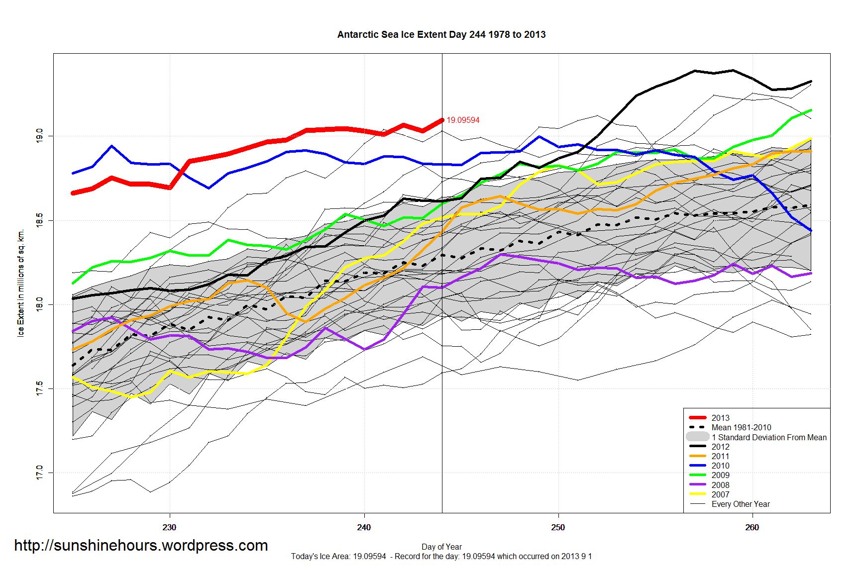 Antarctic Sea Ice Extent is 19.09 million sq km which is 800,000 sq km above the 30 year average.