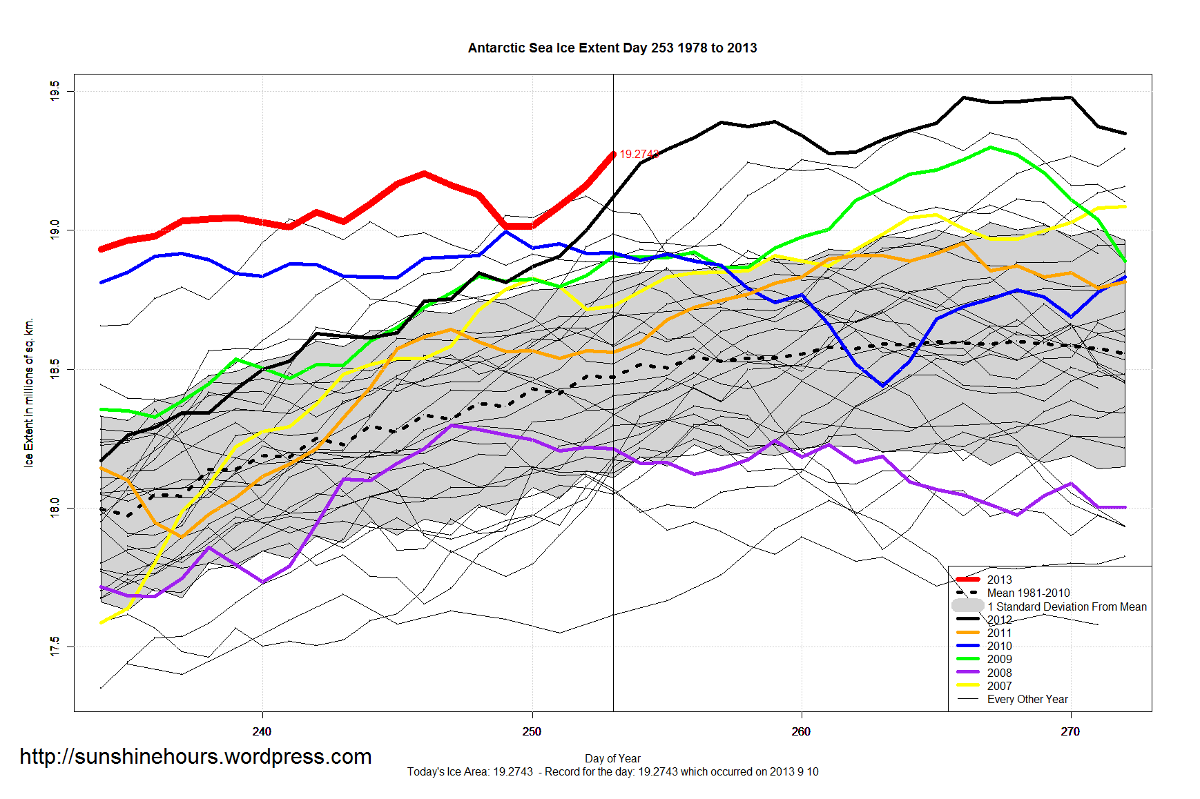 September 10th (Day 253) saw the 42nd Daily Record of the Year for Antarctic Sea Ice Extent. There has been 250,000 sq km of new ice in last 3 Days.
