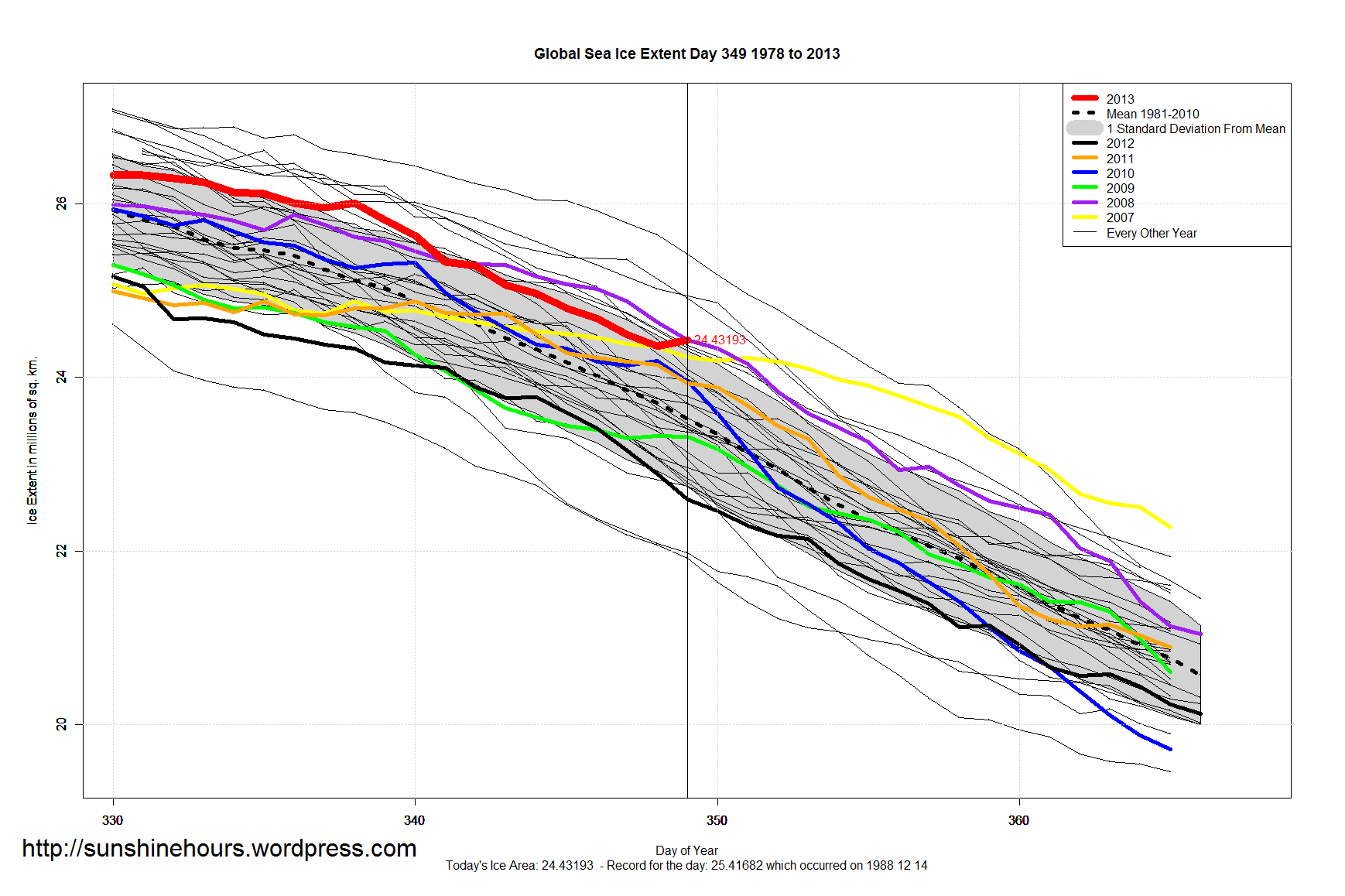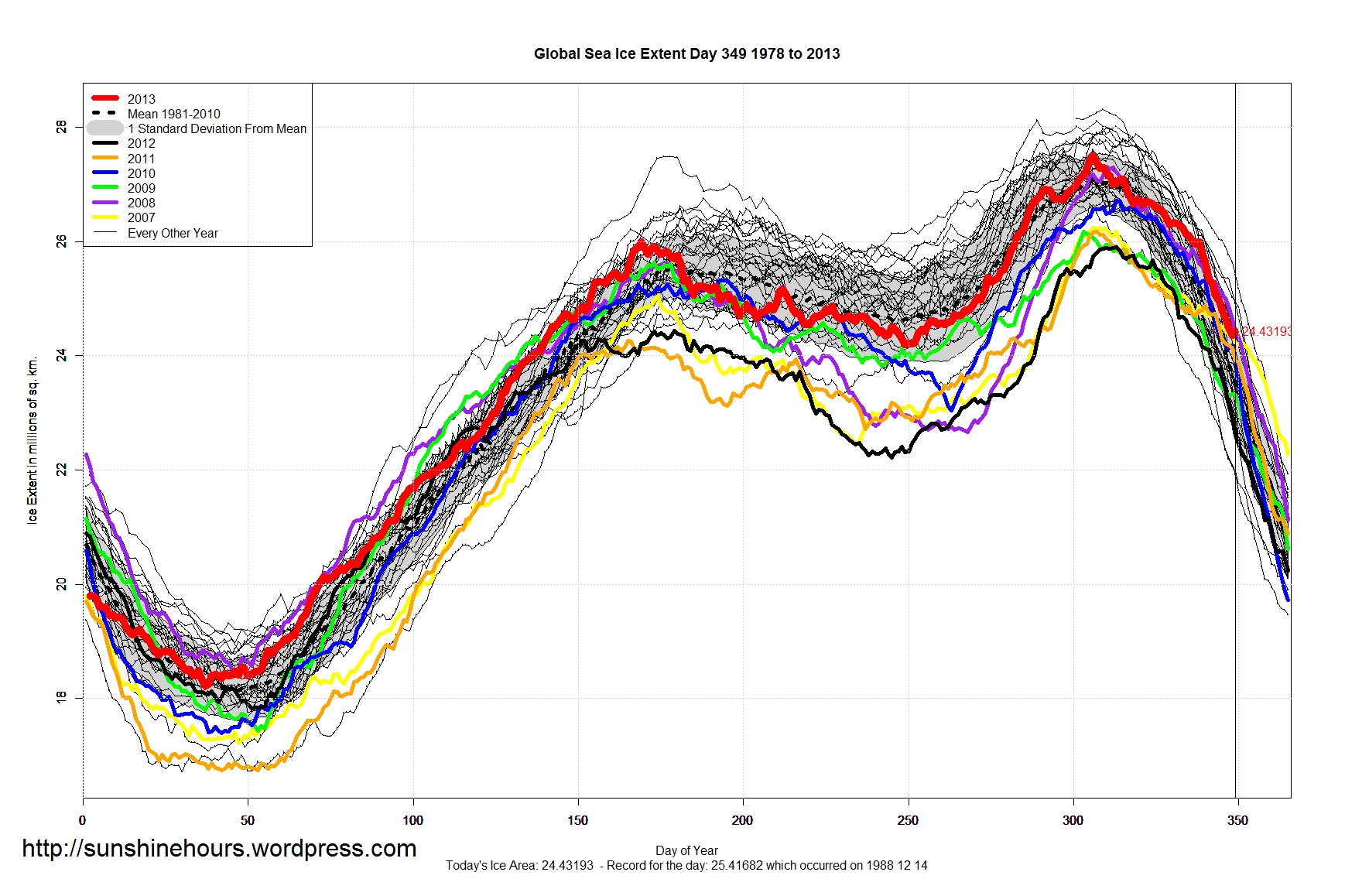 As of Dec 16 2013, Global Sea Ice is the 5th highest for the day, and above the 1981-2010 mean by 900,000 sq km.