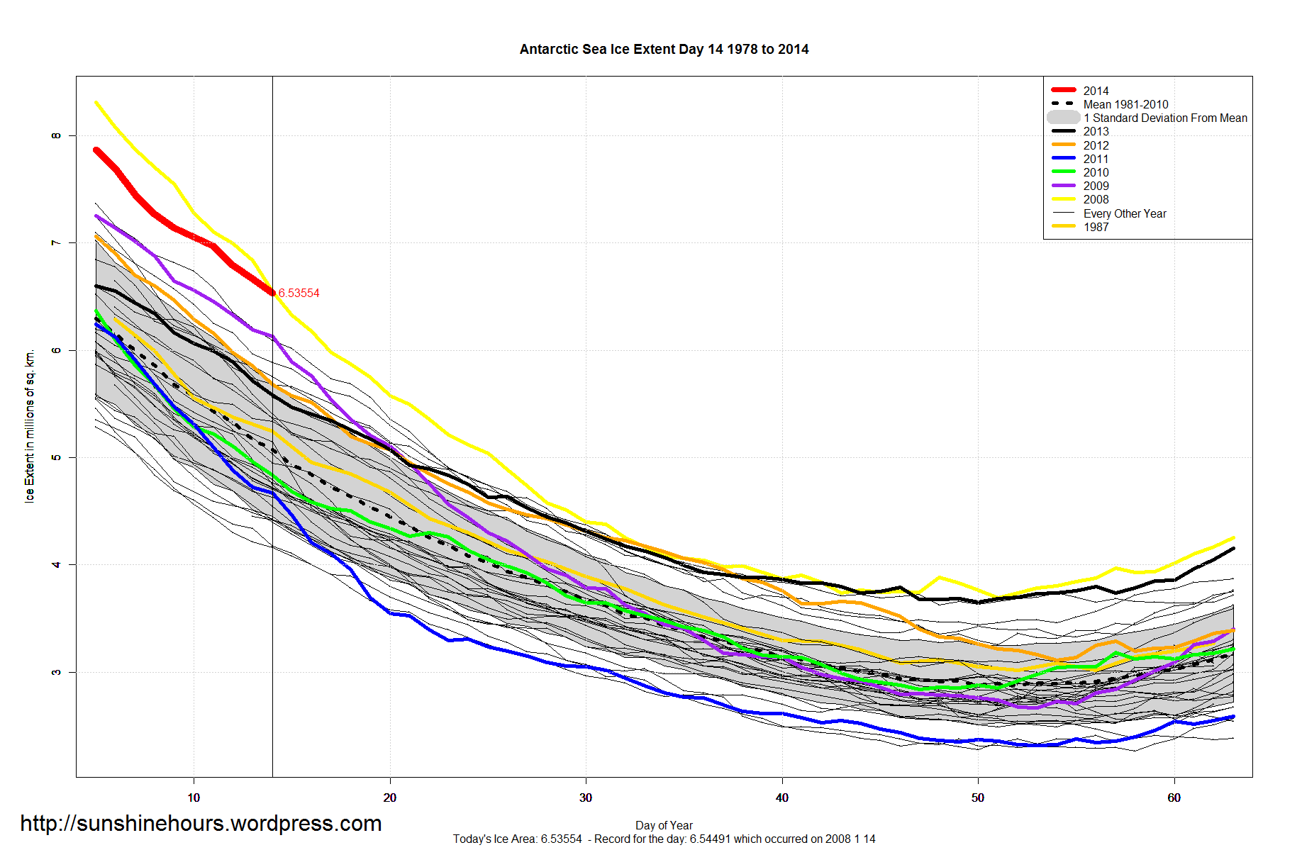 Antarctic Sea Ice Extent on day 14 was only 9370 sq km below the record set in 2008.