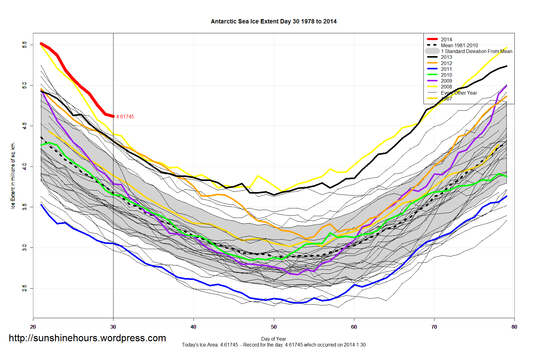 Antarctic Sea Ice Extent as of Jan 30 2014 was 950,000 sq km above the 1981-2010 mean and 220,000 sq km above 2008.