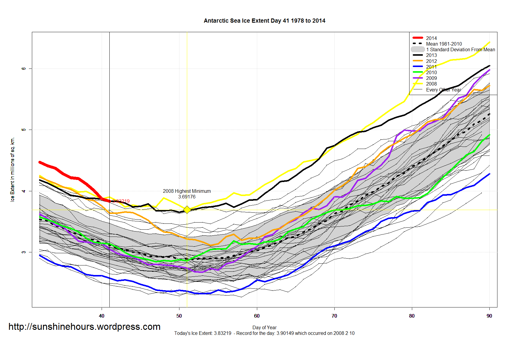So day 46 could turn out to be the day of the minimum Antarctic Sea Ice Extent for 2014. But it could still fall below that. No predictions from me.