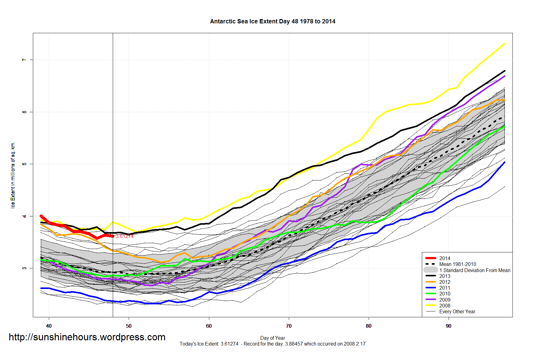 The mean for day 48 is 2.91 million sq km. Sea Ice Extent for day 48 is 3.61 million sq km.