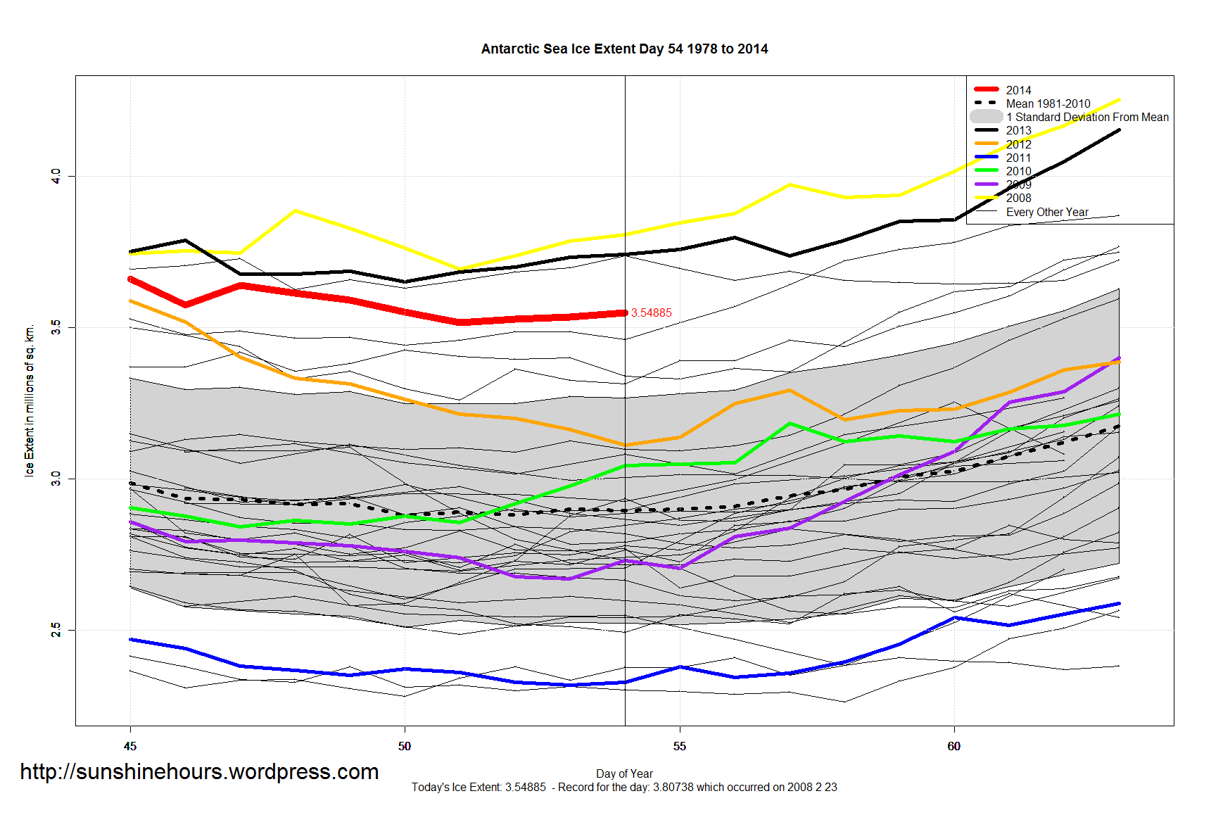 Antarctic Sea Ice Extent has risen for three days in a row. It rose 13,000 sq km and then 7,000 sq km and then 13,000 sq km. Day 51 is potentially to be the minimum, but is still too early to call.