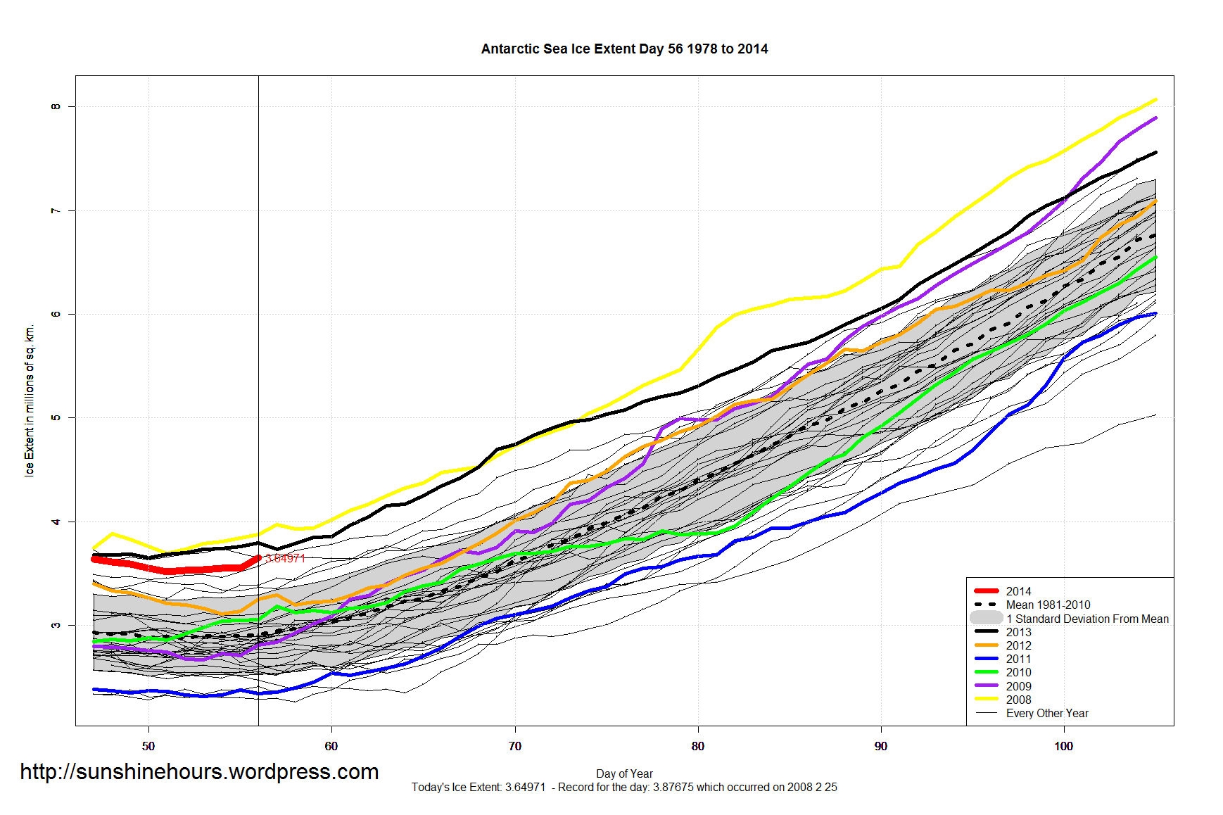 Antarctic Sea Ice Update Feb 26 2014 – Day 56 – Five Days Up Published on February 26, 2014 by sunshinehours1 Antarctic Sea Ice Extent has risen for five days in a row, and is now 130,000 sq km above where it was on day 51 (which will probably be the minimum). Extent is 739,000 sq km above the 1981-2010 mean which is 25%. Click for bigger. Share this: Click to share on X (Opens in new window) X Click to share on Facebook (Opens in new window) Facebook Like Loading... Related