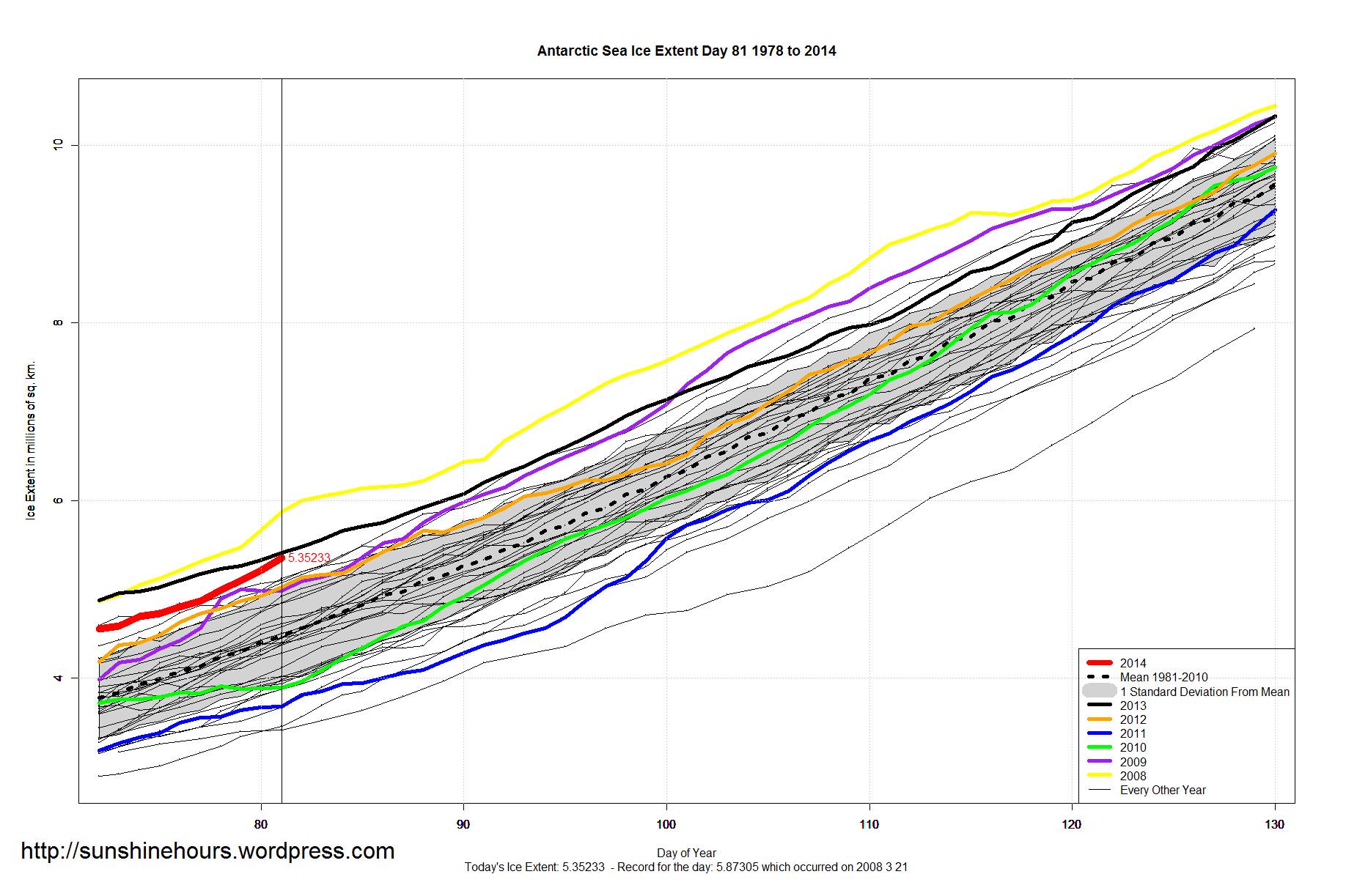 Antarctic Sea Ice Extent Update – 3rd Highest For This Day Published on March 23, 2014March 23, 2014 by sunshinehours1 Antarctic Sea Ice Extent is just under the 2013 track and slowly closing in. Extent is 887,000 sq km above the 1981-2010 mean, about 20% above. Share this: Click to share on X (Opens in new window) X Click to share on Facebook (Opens in new window) Facebook Like Loading... Related