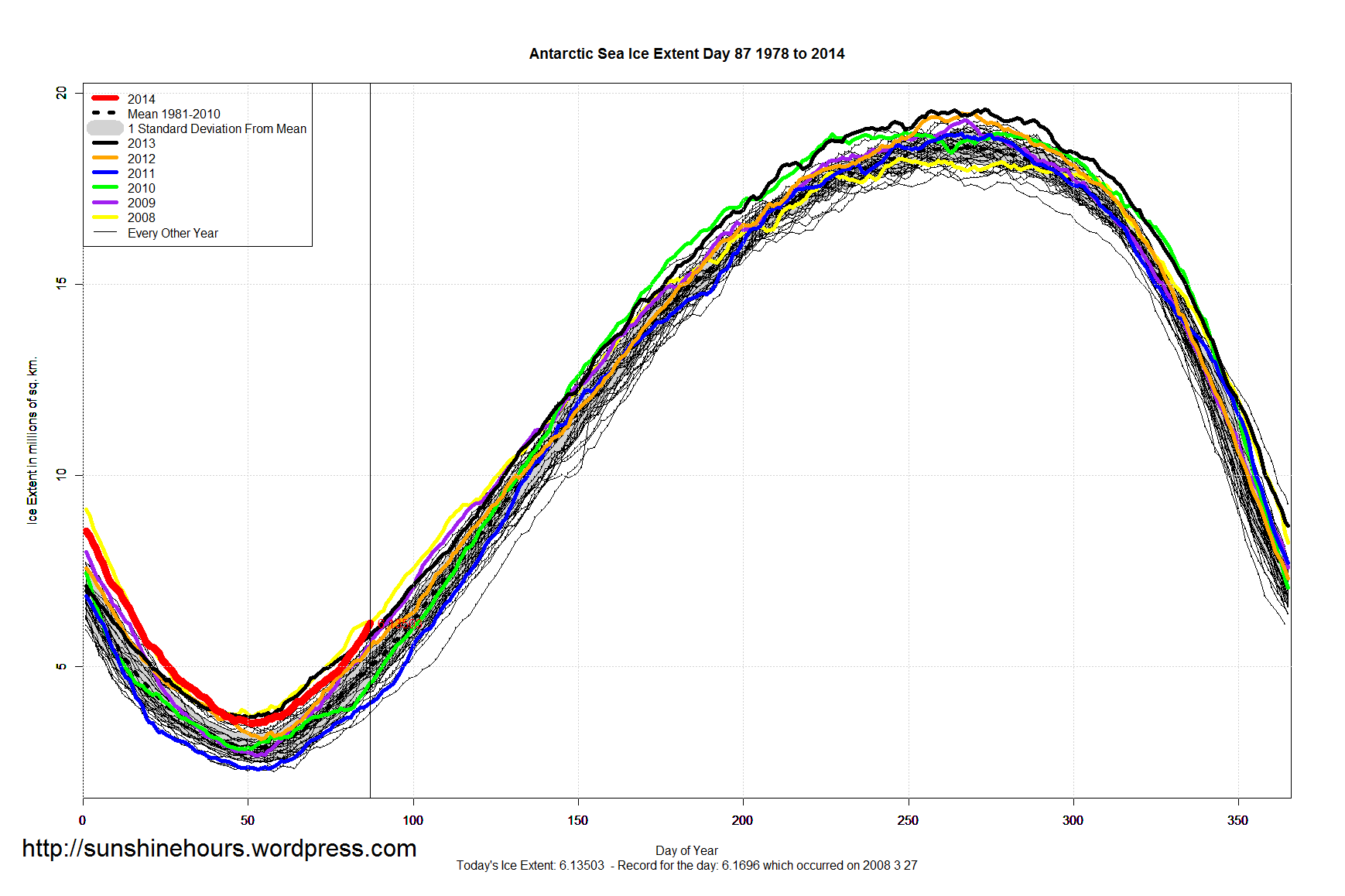 - Antarctic Sea Ice is 1,162,000 sq km above the 1981-2010 mean. 2nd highest for this day and only 35,000 sq km short of the daily record. And still climbing fast enough to break the daily record in 1 or 2 days.