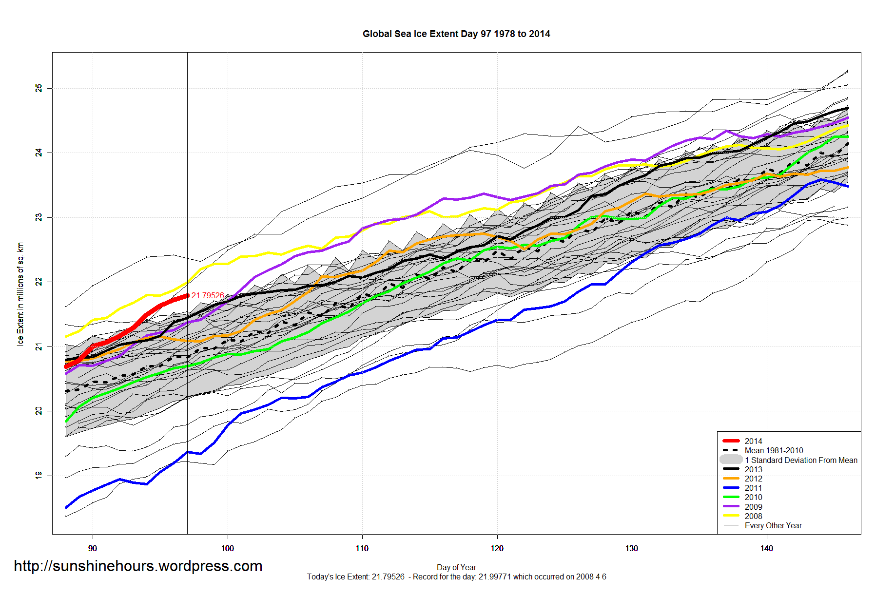 5 thoughts on “Sea Ice Update April 8 2014 – Global Sea Ice 959,000 Above The Mean and Antarctica Set Another Record