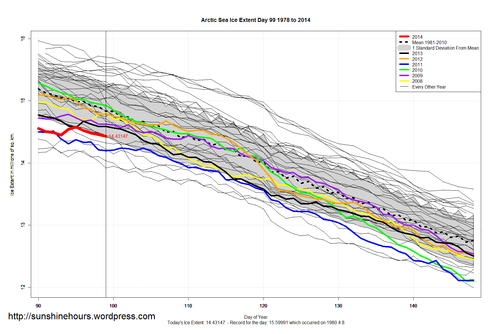 - Arctic Sea Ice Extent is -405,000 sq km below the 1981-2010 mean. That is just inside the one standard deviation mark.