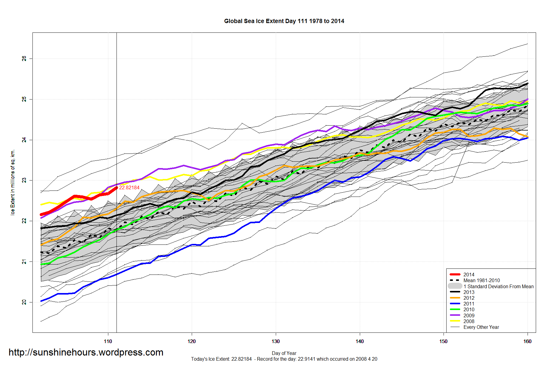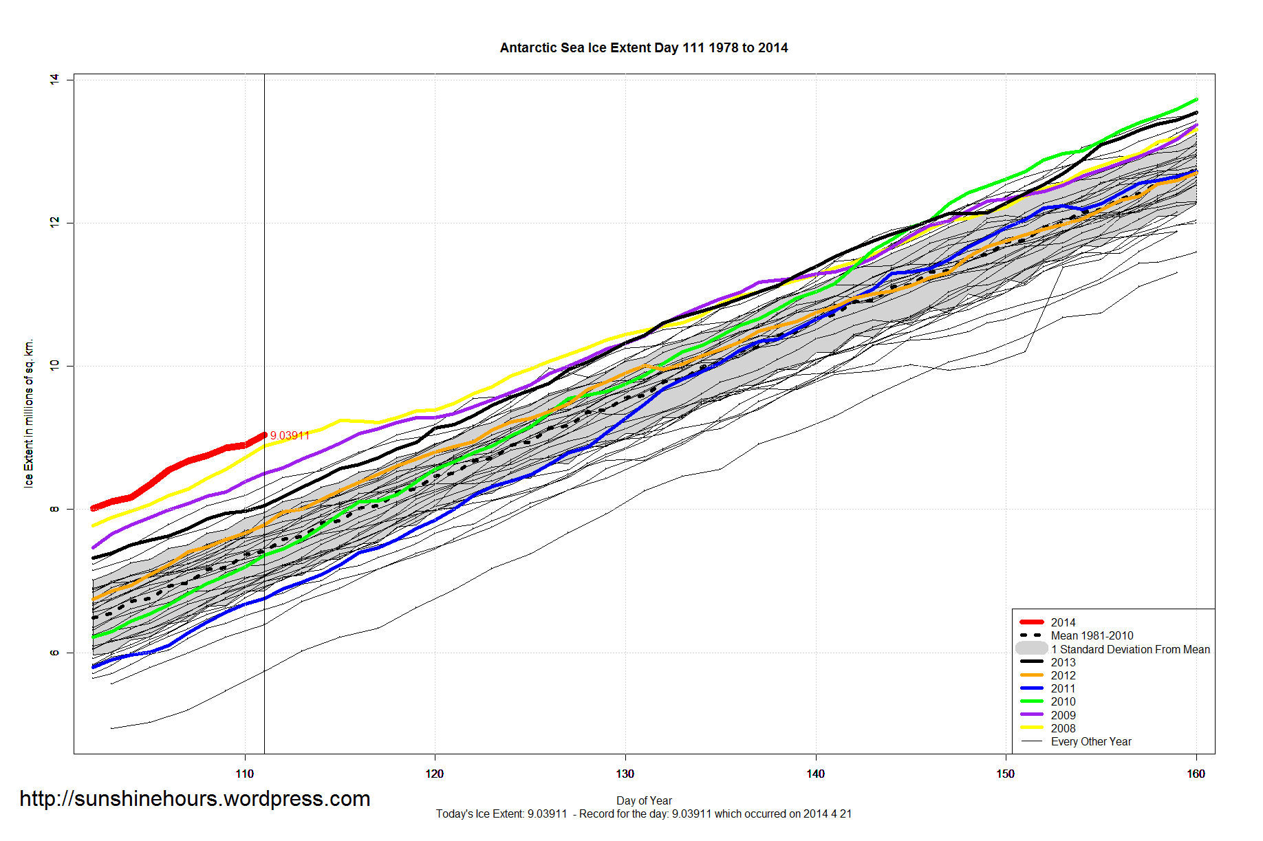 - Antarctic Sea Ice Extent is 1,627,000 sq km above the 1981-2010 mean. That is the 44th daily record for 2014.