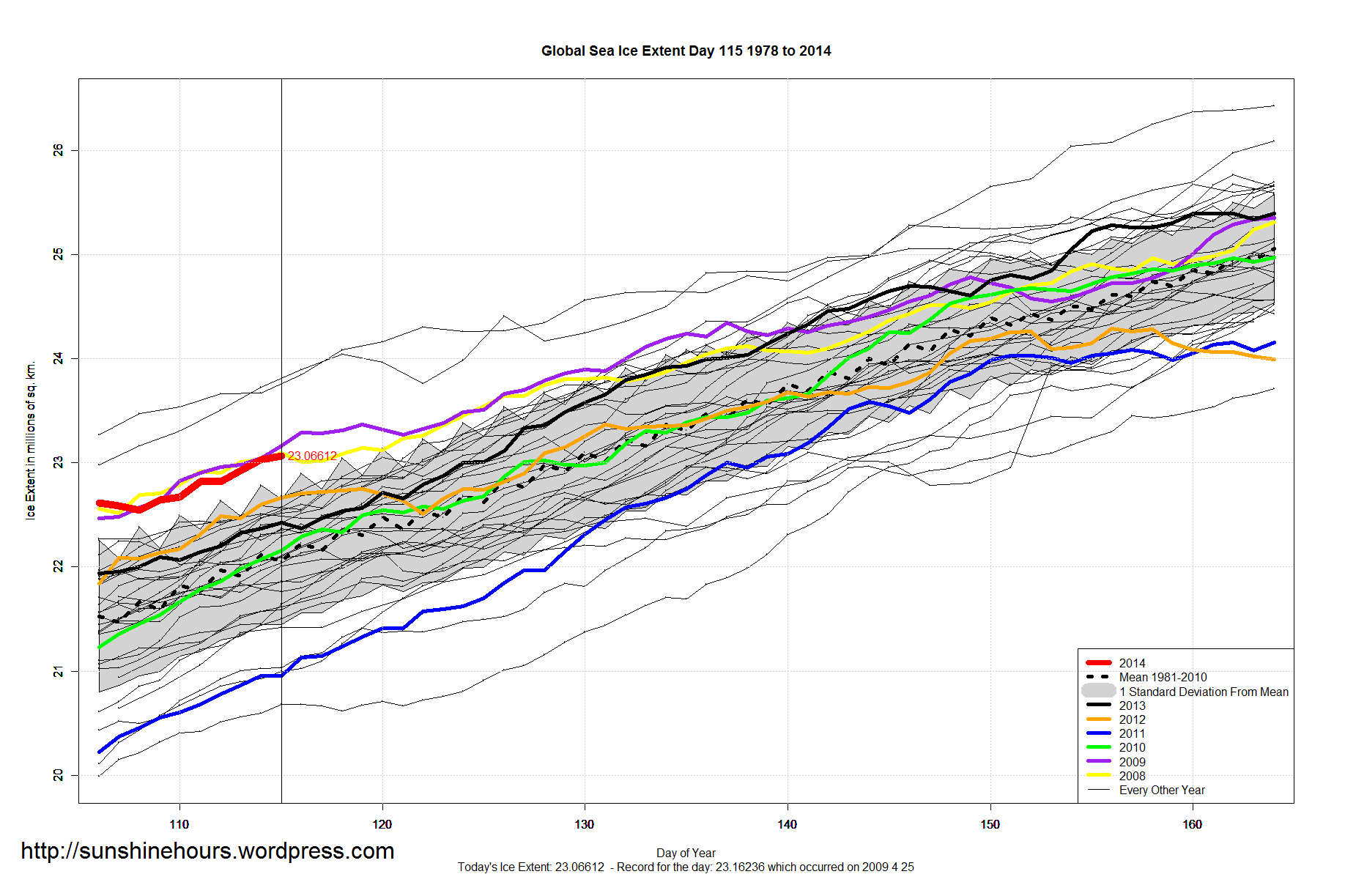 One thought on “Sea Ice Update April 26 2014 – Antarctic Sea Ice 48th Daily Record of 2014 – Global Sea Ice 1.02 million sq km Above Normal”