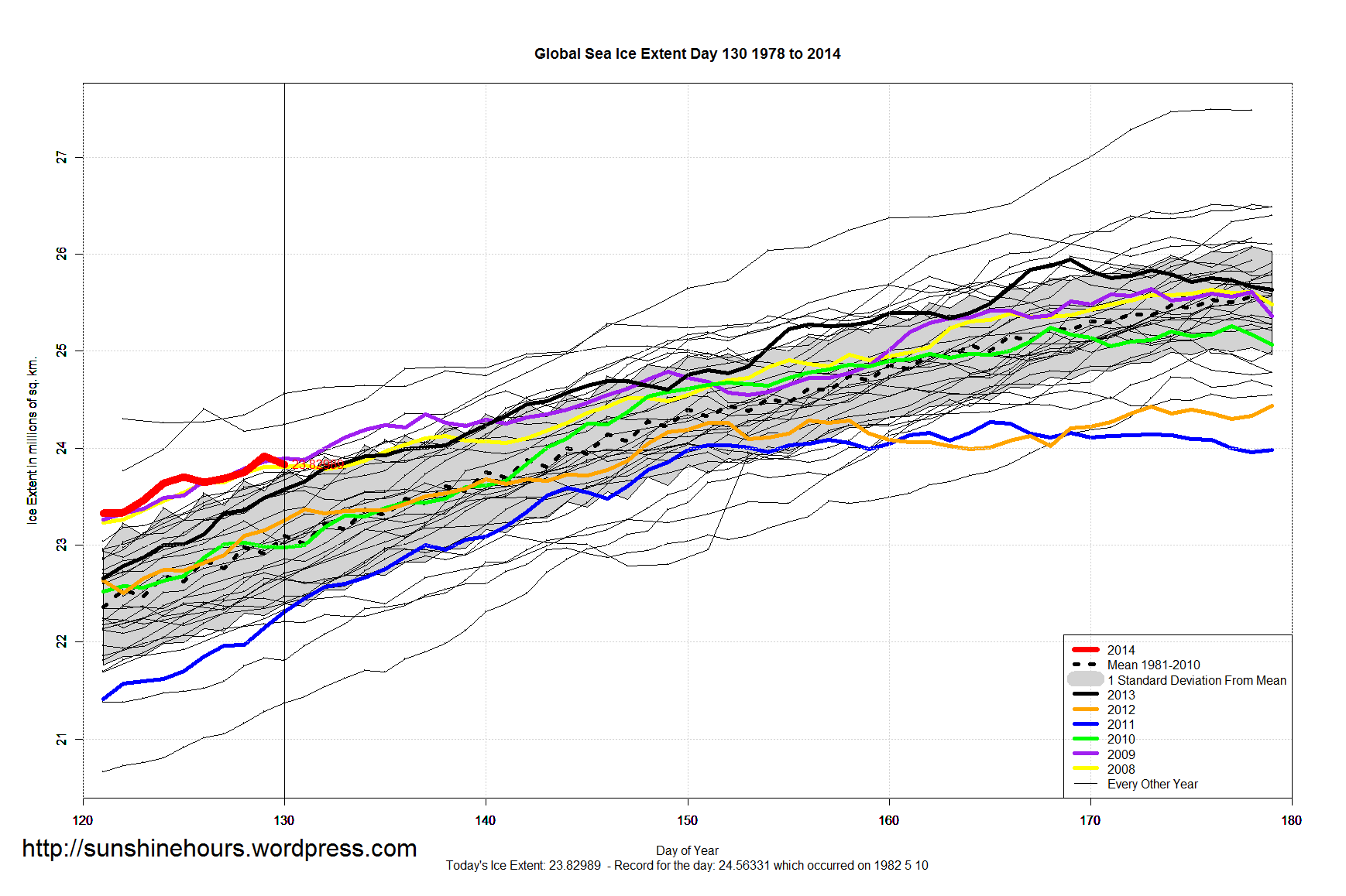 One thought on “Sea Ice Update May 11 2014 – Antarctic 63rd Daily Record of 2014 – Global Sea Ice 785,000 sq km Above Normal”