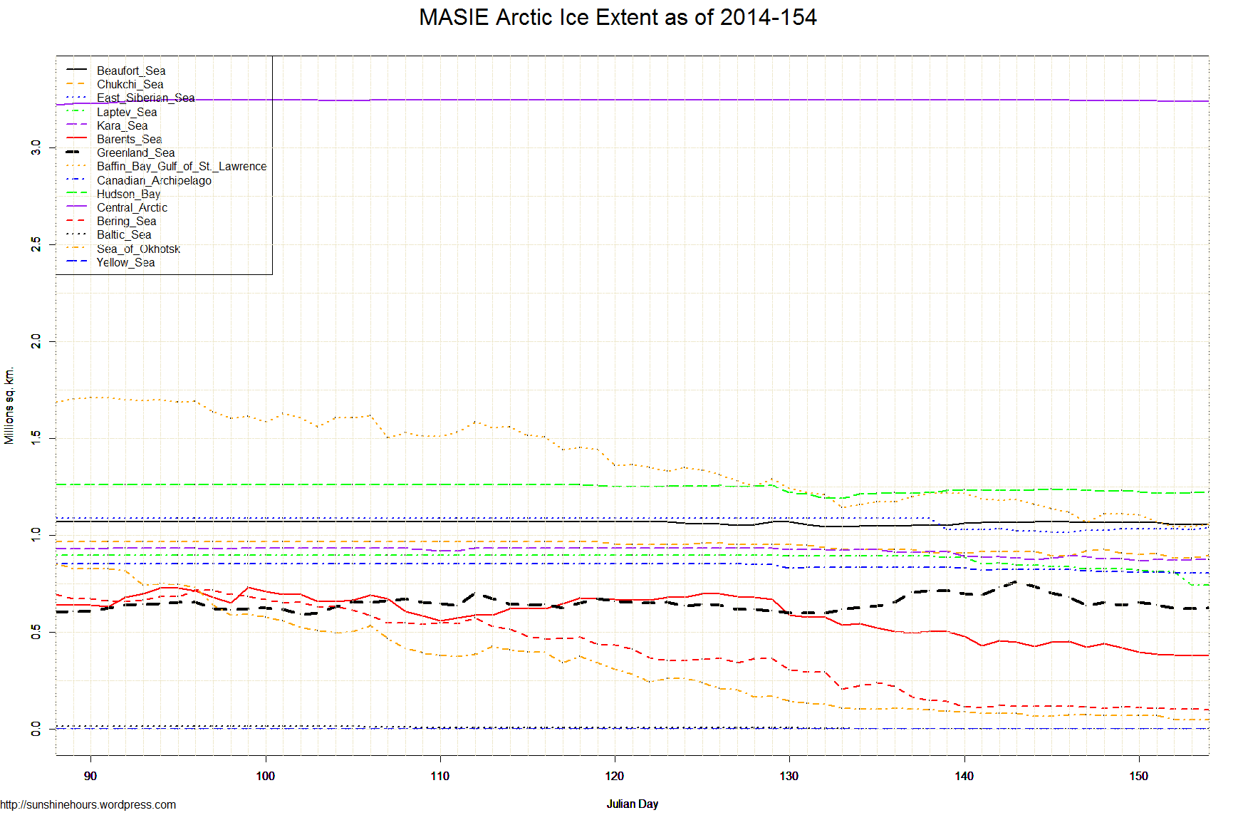 June 4 2014 MASIE Update – Arctic Sea Ice actually rose 31,421 sq km over the last day because of the Chukchi Sea, Greenland Sea, East Siberian Sea and Baffin Bay.