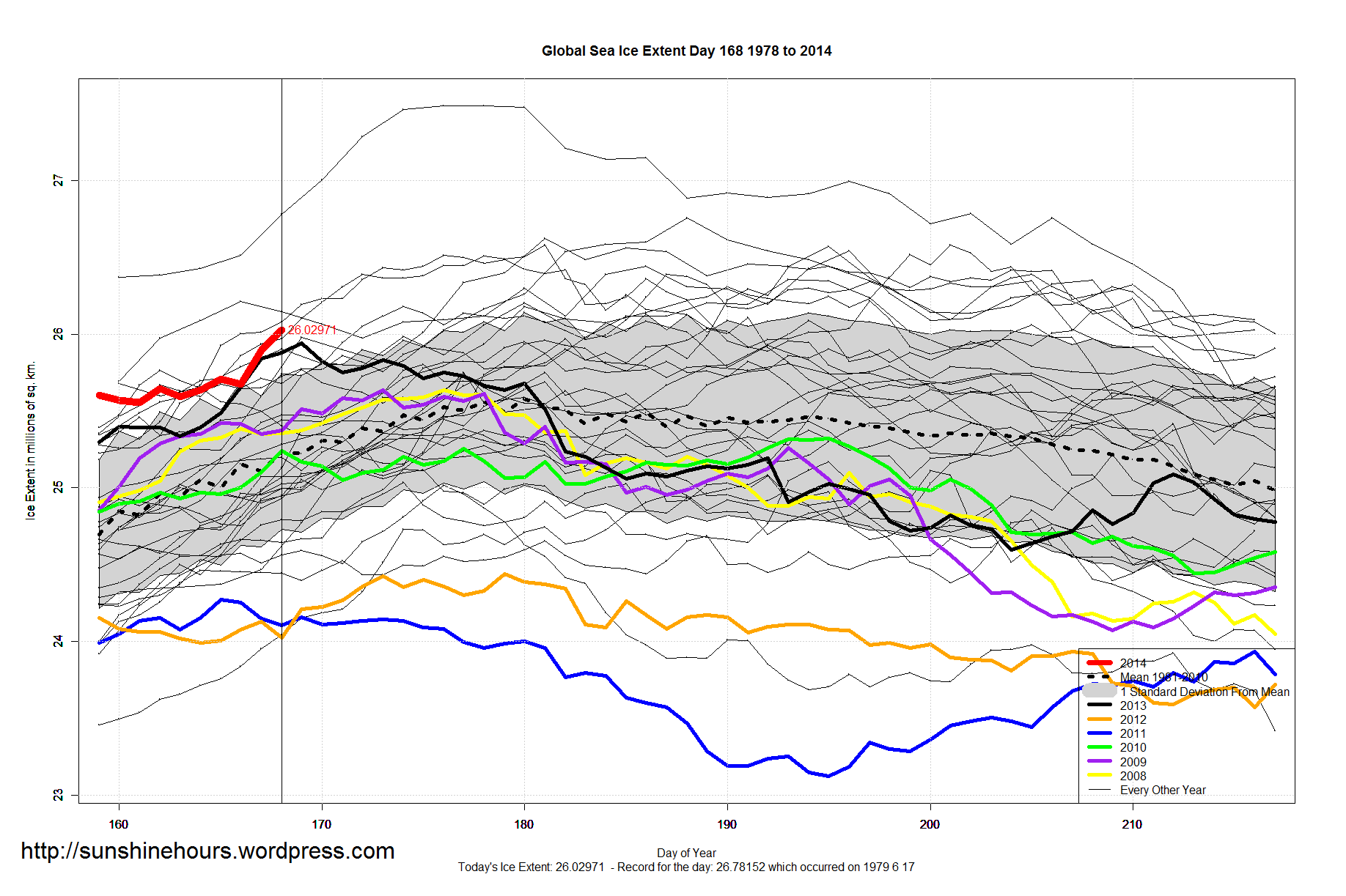 Global Sea Ice Highest Since 1996 (for this day) Published on June 18, 2014 by sunshinehours1 Only 3 years had more global sea ice on day 168 – 1979,1982 and 1996 . Share this: Share on X (Opens in new window) X Share on Facebook (Opens in new window) Facebook Like Loading... Related