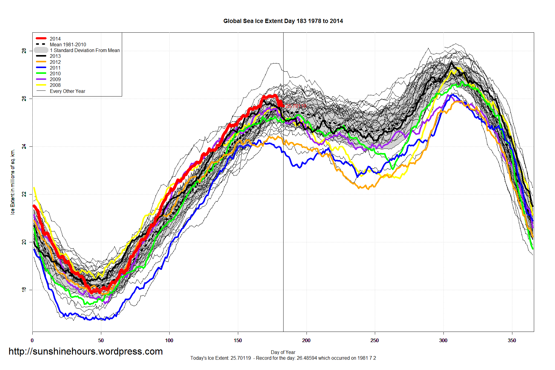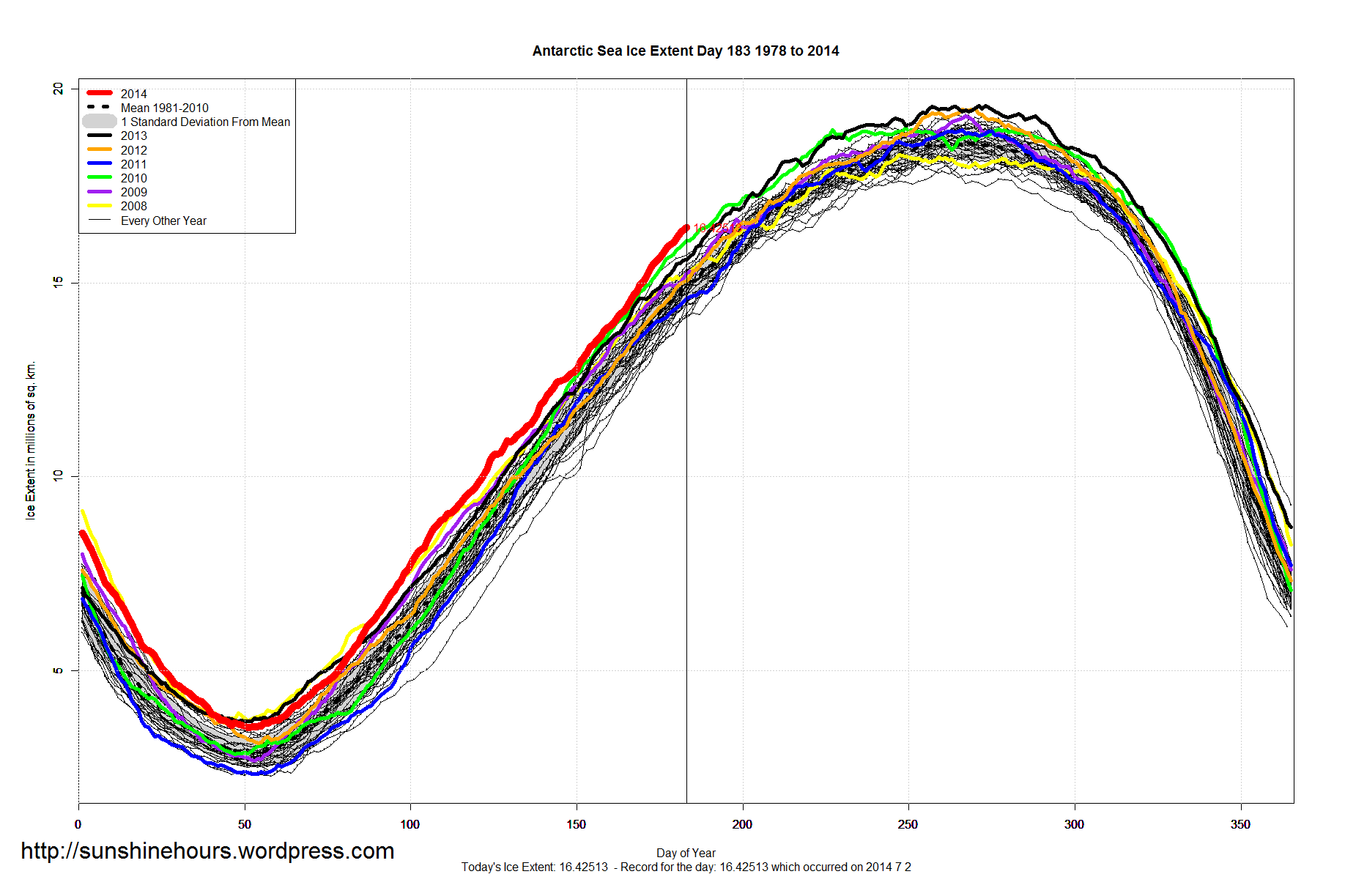 - Antarctic Sea Ice Extent is 1,527,000 sq km above the 1981-2010 mean. That is ranked 1 for the day. There have been 116 daily records set in 2014.