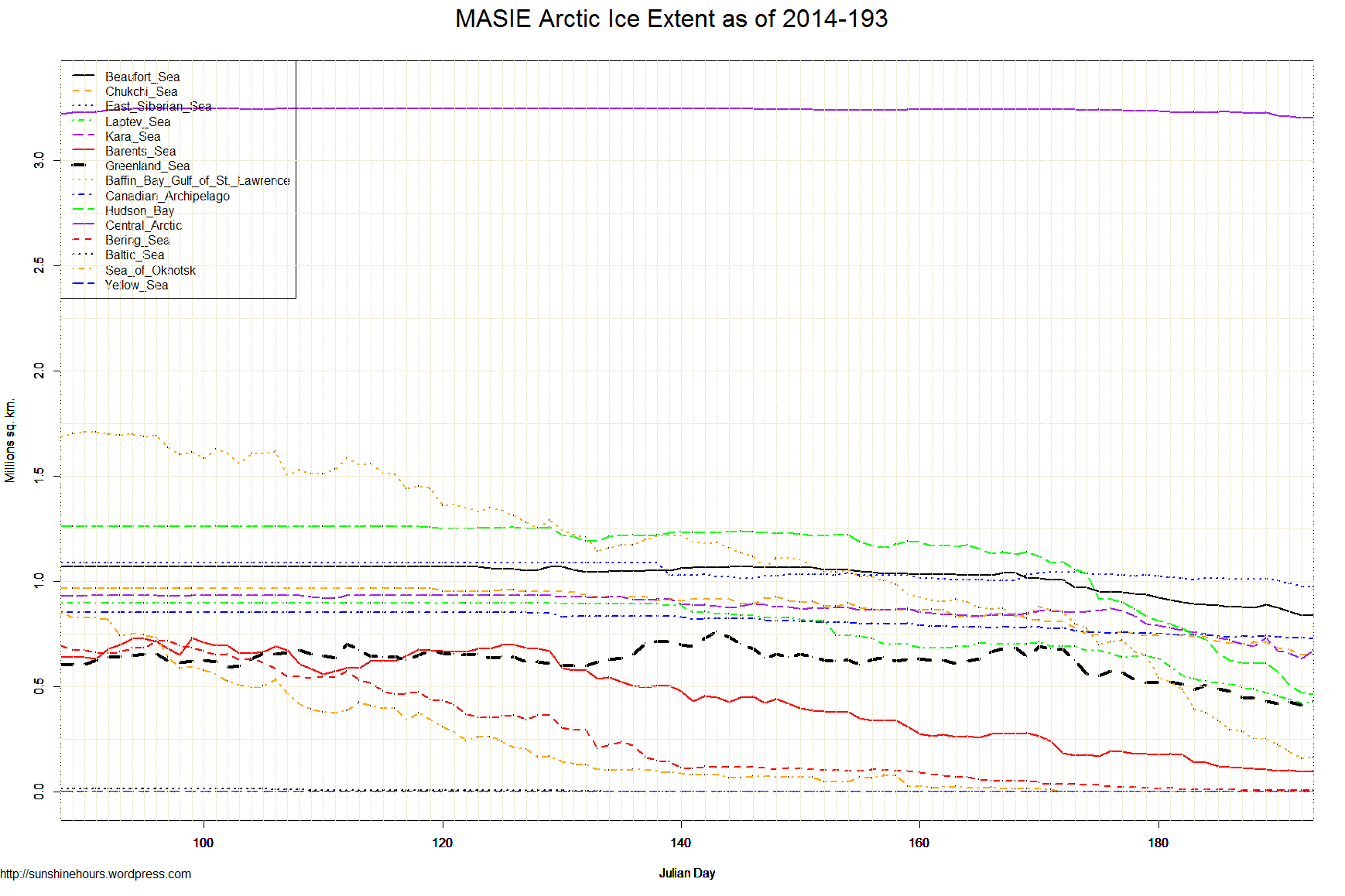 July 13 2014 MASIE Update – Some regions froze a little over the last day. The blue regions are either completely melted or very close to it.