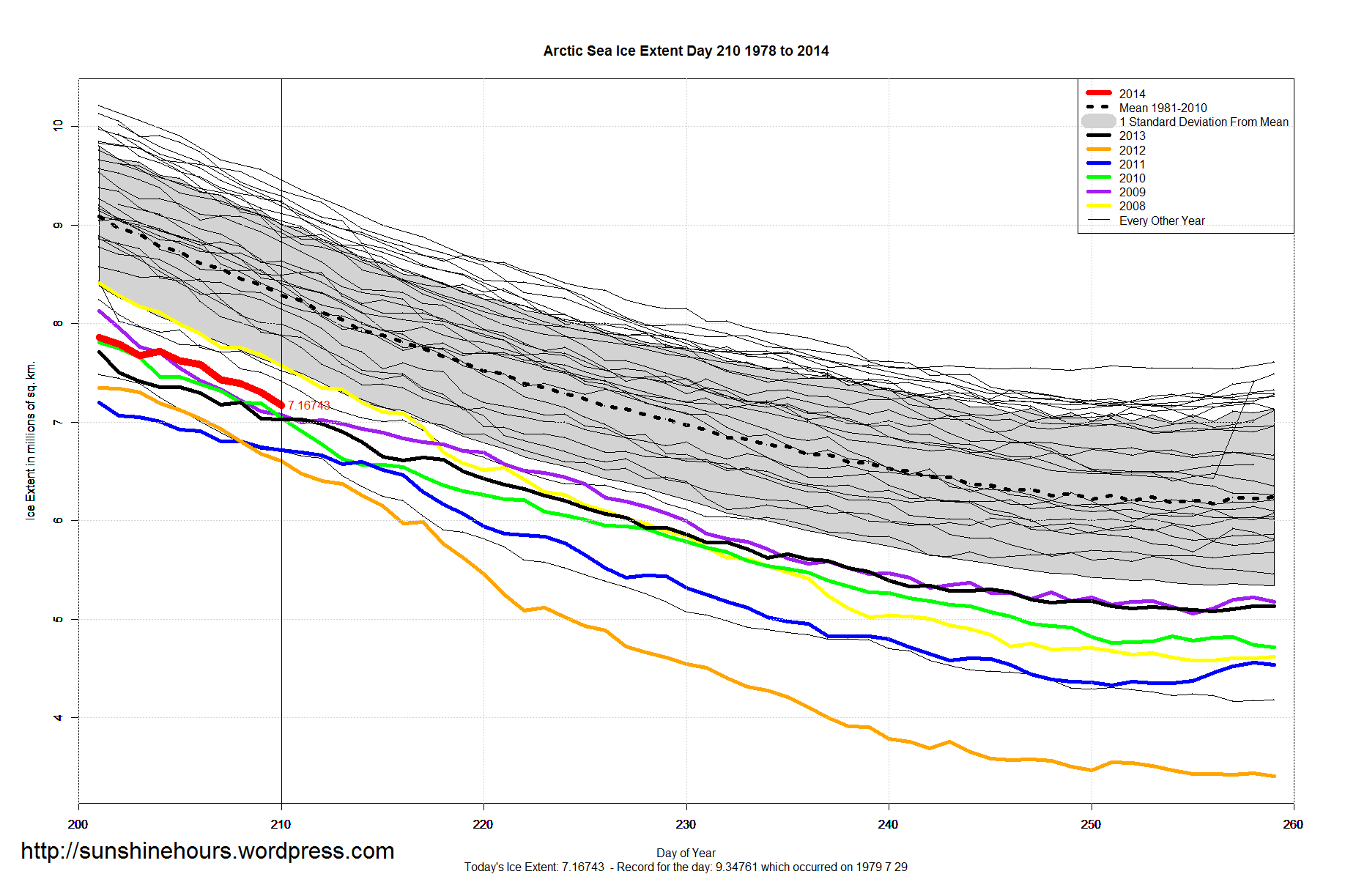 Arctic Sea Ice Extent – July 30 2014 Update Published on July 30, 2014July 30, 2014 by sunshinehours1 Arctic Sea Ice Extent is now melting at a relatively “normal” rate. Share this: Click to share on X (Opens in new window) X Click to share on Facebook (Opens in new window) Facebook Like Loading... Related