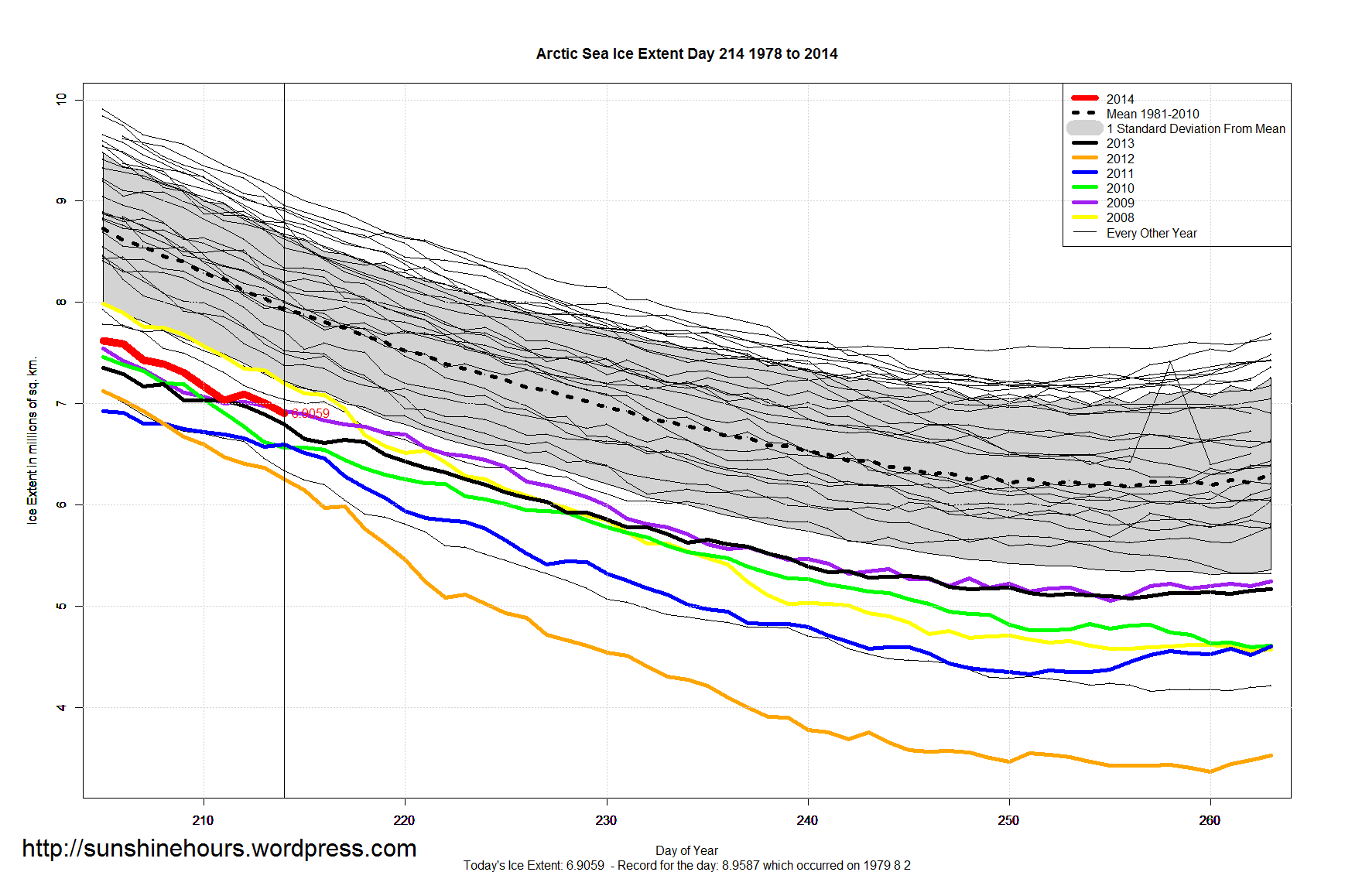 Arctic Sea Ice Extent – Aug 3 2014 – Still Higher Than 2007, 2010, 2011, 2012 and 2013 Published on August 3, 2014 by sunshinehours1 (NOTE: Antarctic data has not been updated for 2 days. So I cannot post the Antarctic or Global update) Arctic Sea Ice Extent is -1.1 million sq km below the 1981-201 mean. It is higher than it was in 2007, 2010, 2011, 2012 and 2013. Share this: Click to share on X (Opens in new window) X Click to share on Facebook (Opens in new window) Facebook Like Loading... Related