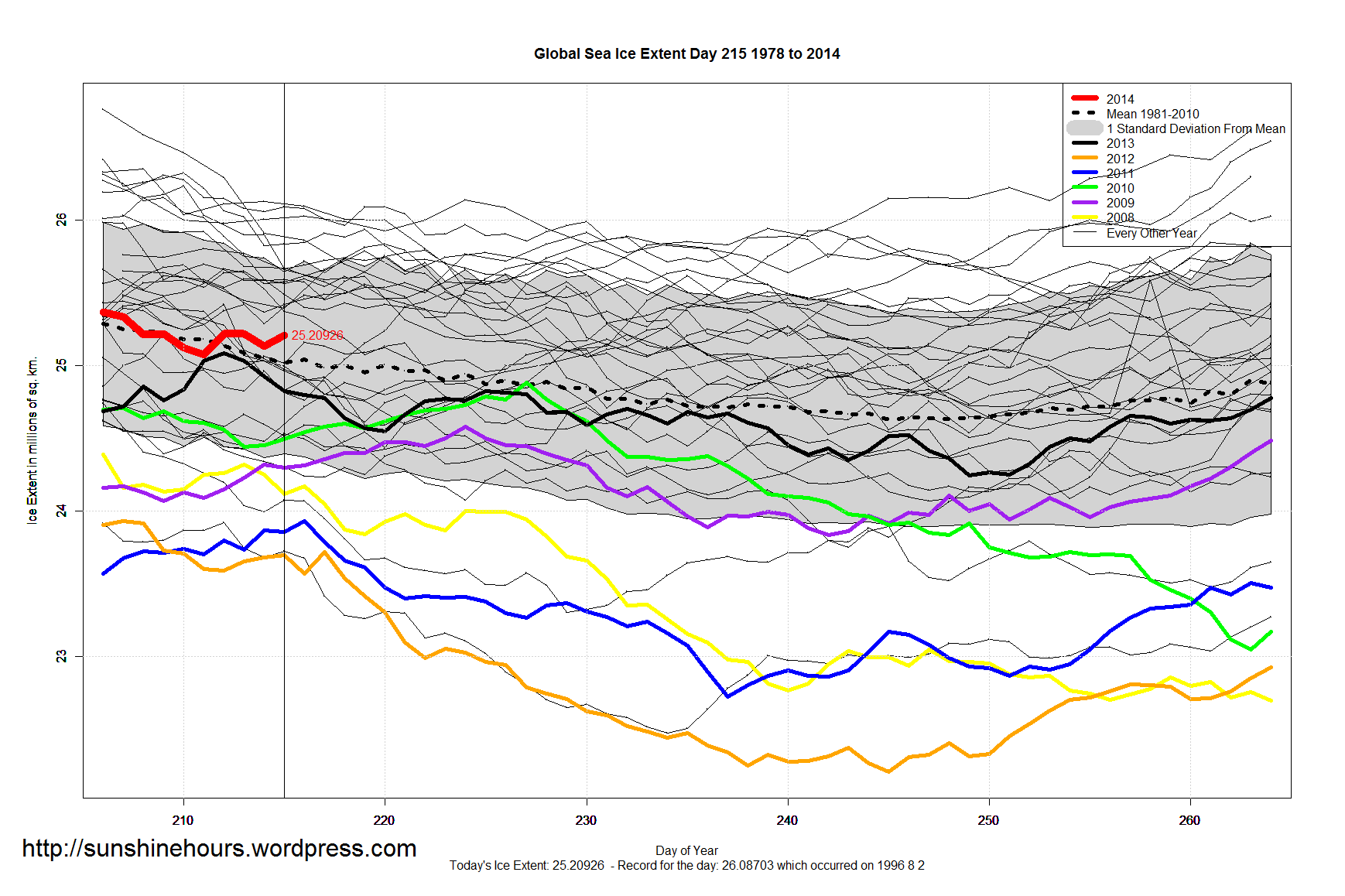 Today’s global sea ice extent is the 2nd highest for this day from 2001 – 2014. 2004 was 200,000 sq km higher.