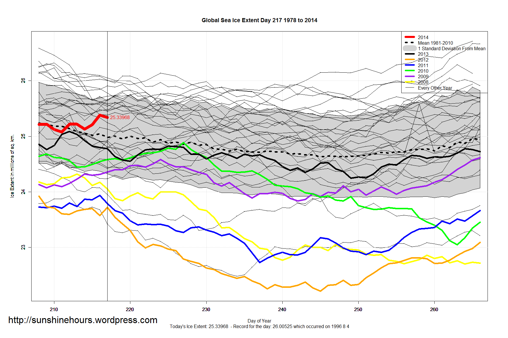 Global Sea Ice Extent Aug 6 2014 – 293,000 sq km Above Normal Published on August 6, 2014 by sunshinehours1 Global Sea Ice Extent is 293,000 sq km above the 1981-2010 mean. Still higher than any year (for day 217) since 2000. Share this: Share on X (Opens in new window) X Share on Facebook (Opens in new window) Facebook Like Loading... Related