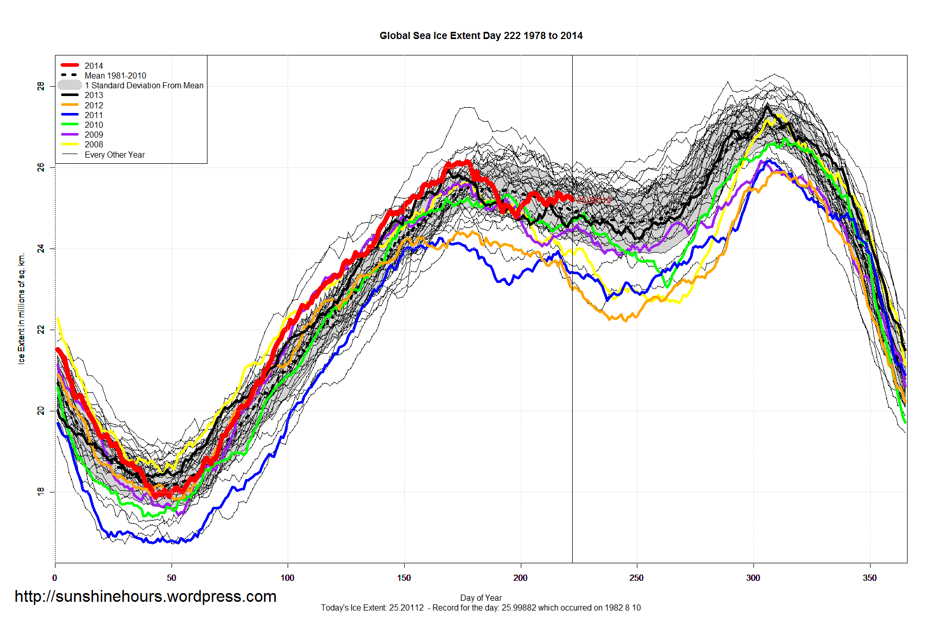 Global Sea Ice Extent Aug 11 2014 – 215,000 sq km Above Normal Published on August 11, 2014 by sunshinehours1 Global Sea Ice Extent is 215,000 sq km above the 1981-2010 mean. Still higher than any year (for day 222) since 2000. And 2,000,000 sq km higher than 2012. Share this: Click to share on X (Opens in new window) X Click to share on Facebook (Opens in new window) Facebook Like Loading... Related