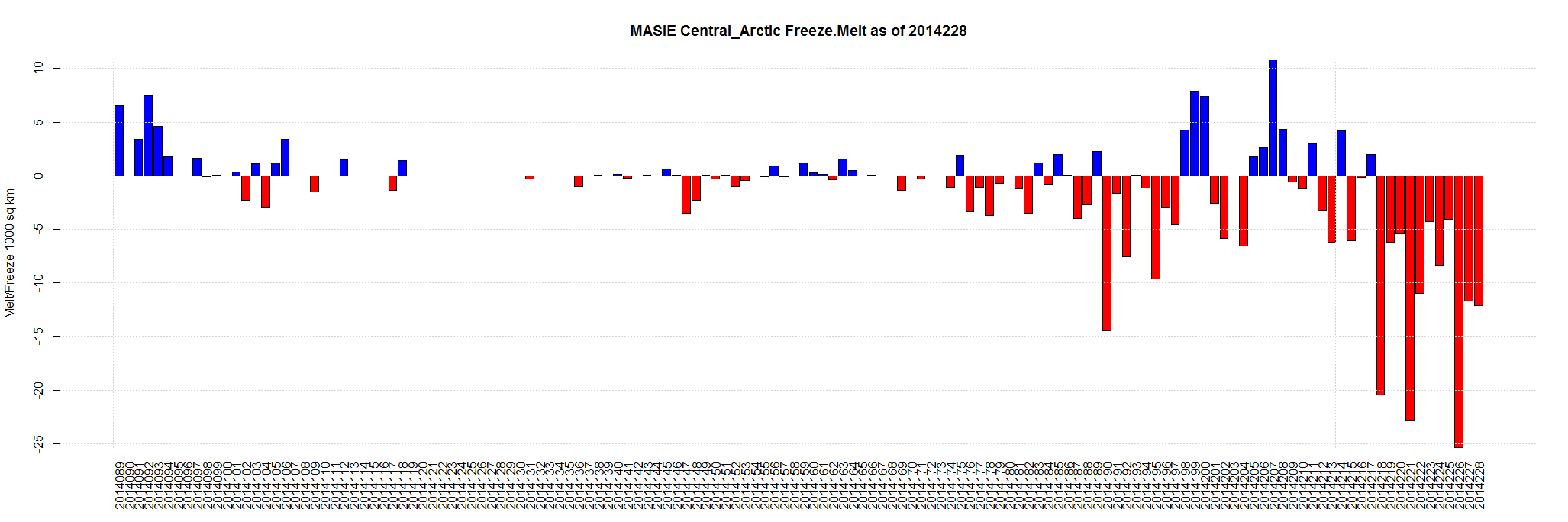 Aug 17 2014 MASIE Update – Steady Melting … Central Arctic is melting … But it has slowed from 25,000 sq km a day to 12,000 sq km over last two days