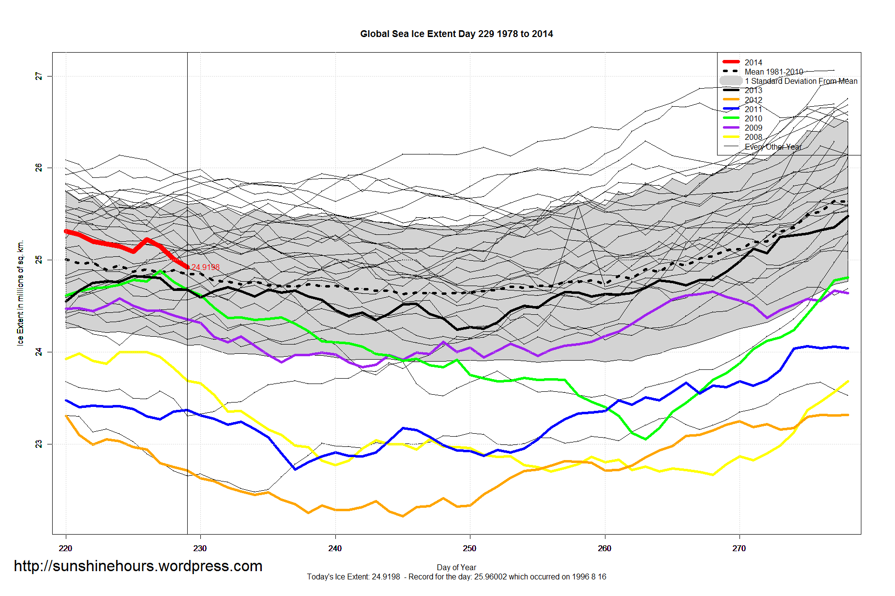 Global Sea Ice Extent Aug 18 2014 – 7,000 sq km above Normal Published on August 18, 2014 by sunshinehours1 Global Sea Ice Extent Aug 18 2014 – 7,000 sq km above the 1981-2010 mean. Data for Day 229. Data here. Share this: Click to share on X (Opens in new window) X Click to share on Facebook (Opens in new window) Facebook Like Loading... Related