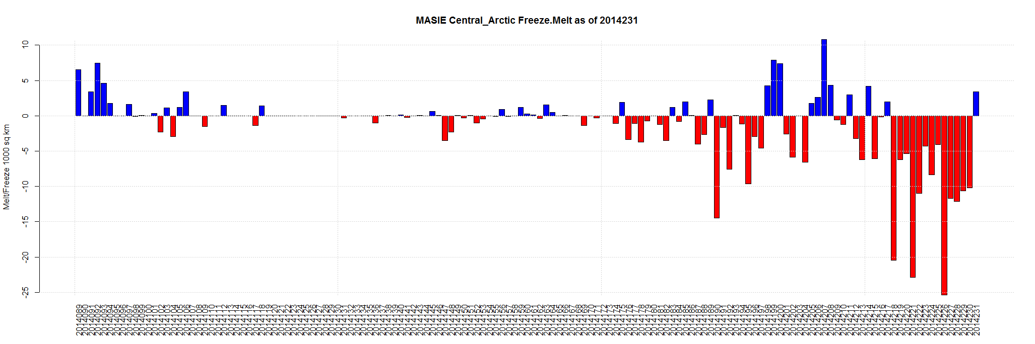 Aug 20 2014 MASIE Update – Tiny Melt … Central Arctic has more ice for first time in 2 weeks. 3 other regions also grew (see bottom table).