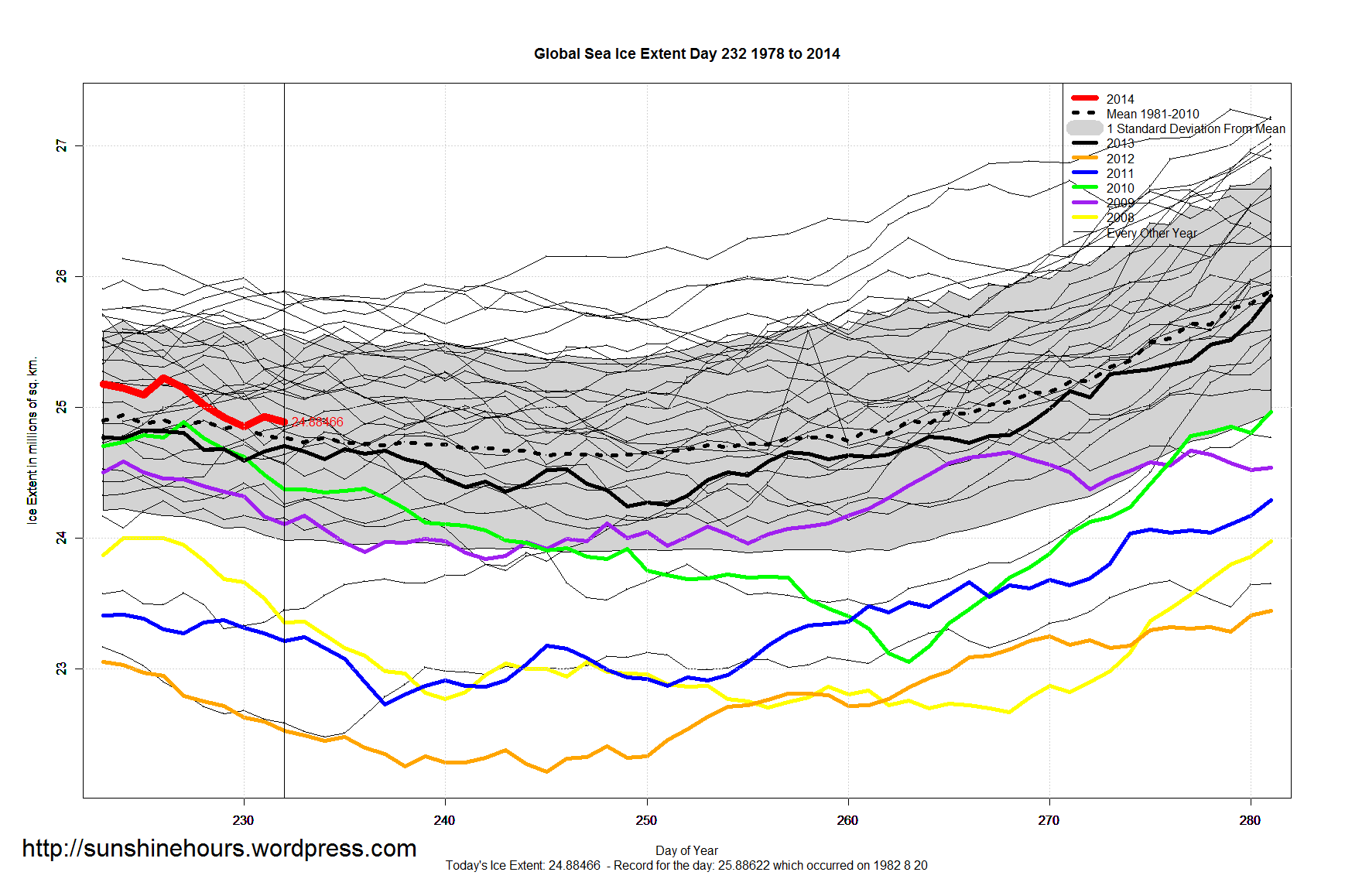 Global Sea Ice Extent Aug 21 2014 – 59,000 sq km above Normal Published on August 21, 2014 by sunshinehours1 Global Sea Ice Extent Aug 21 2014 – 59,000 sq km above the 1981-2010 mean. Data for Day 232. Data here. Share this: Click to share on X (Opens in new window) X Click to share on Facebook (Opens in new window) Facebook Like Loading... Related