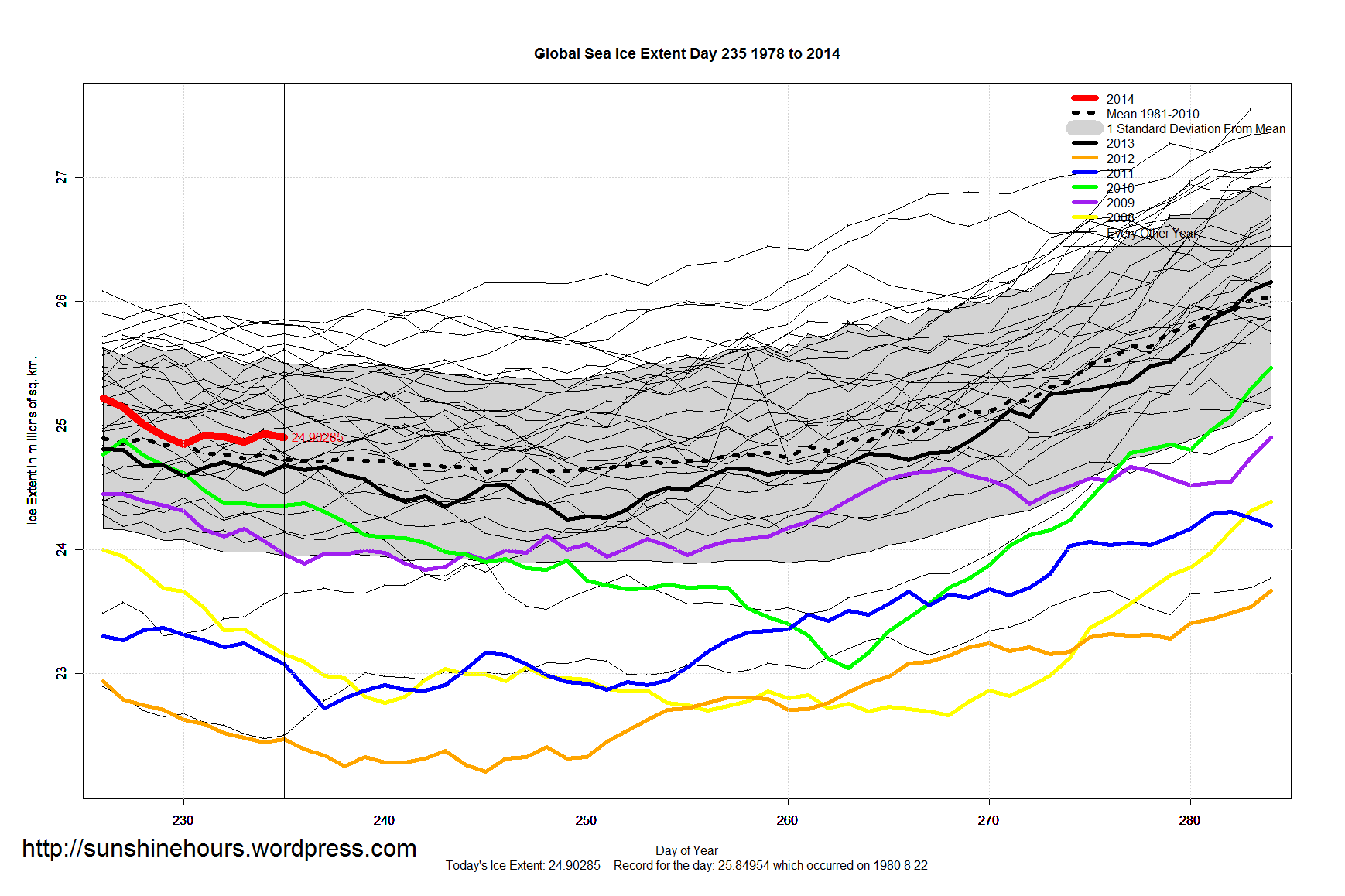 Global Sea Ice Extent Aug 24 2014 – 101,000 sq km above Normal Published on August 24, 2014August 24, 2014 by sunshinehours1 Global Sea Ice Extent Aug 24 2014 – 101,000 sq km above the 1981-2010 mean. Data for Day 235. Data here. Share this: Click to share on X (Opens in new window) X Click to share on Facebook (Opens in new window) Facebook Like Loading... Related