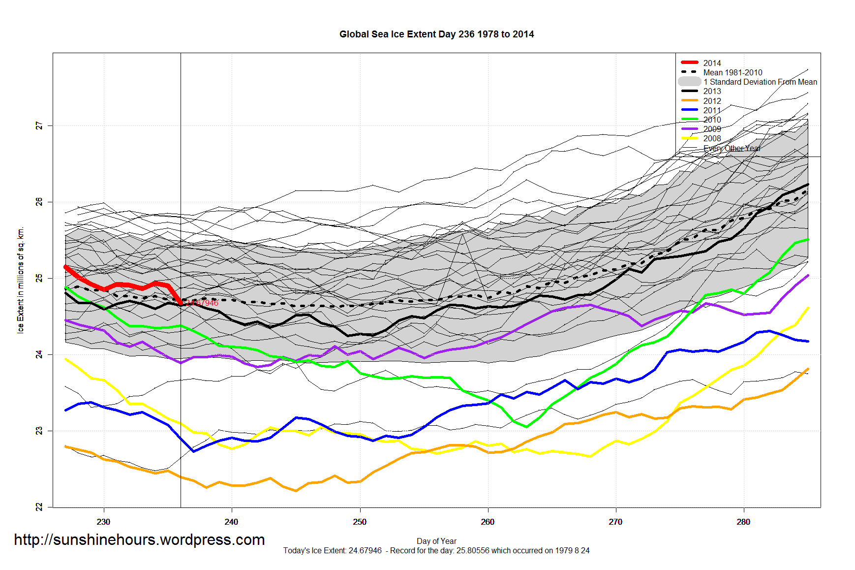 Global Sea Ice Extent Aug 25 2014 – -103,000 sq km below Normal Published on August 25, 2014 by sunshinehours1 Global Sea Ice Extent Aug 25 2014 – -103,000 sq km below the 1981-2010 mean. Data for Day 236. Data here. Share this: Click to share on X (Opens in new window) X Click to share on Facebook (Opens in new window) Facebook Like Loading... Related