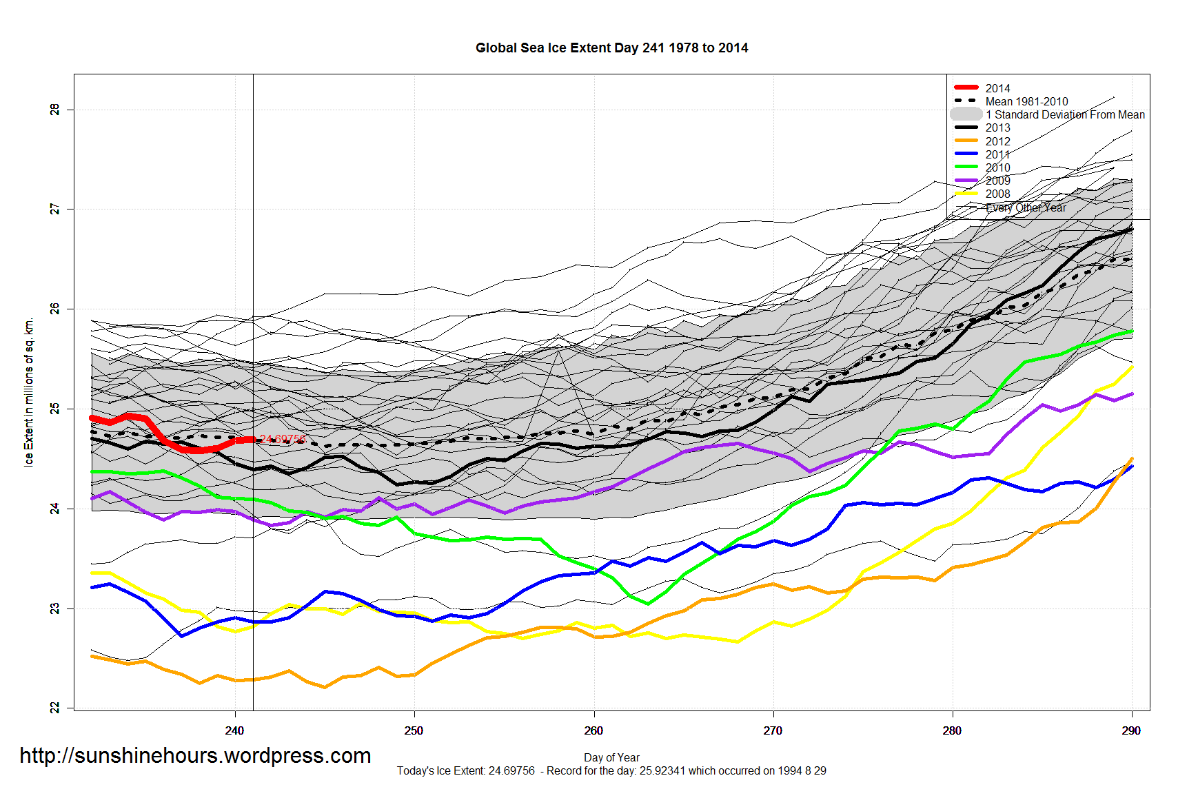 Global Sea Ice Extent Aug 30 2014 – Dead Center On The Mean Published on August 30, 2014August 30, 2014 by sunshinehours1 Global Sea Ice Extent Aug 30 2014 – Data for Day 241. Data here. Share this: Click to share on X (Opens in new window) X Click to share on Facebook (Opens in new window) Facebook Like Loading... Related
