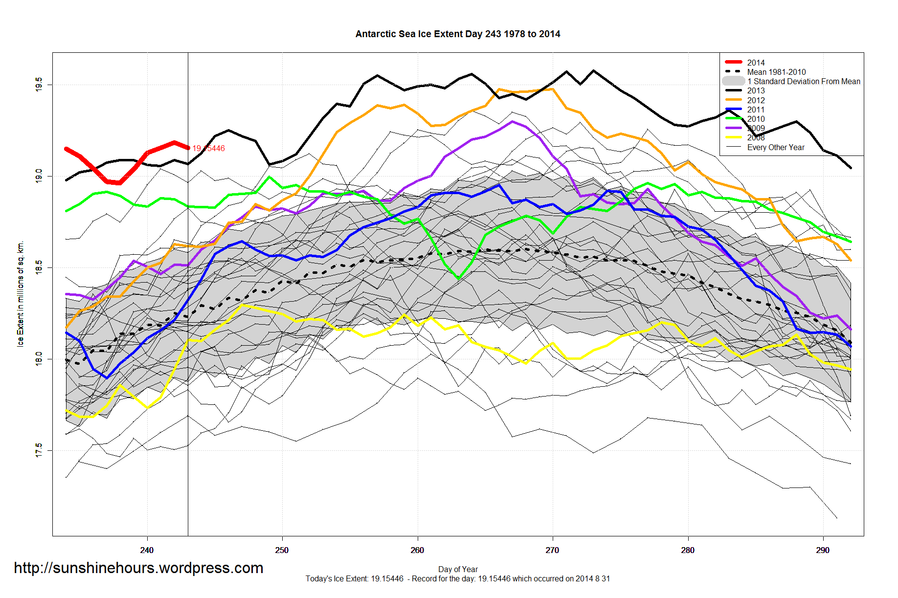Antarctic Sea Ice Extent Sep 01 2014 – 924,000 sq km above Normal Published on September 1, 2014 by sunshinehours1 Antarctic Sea Ice Extent Sep 01 2014 – 924,000 sq km above the 1981-2010 mean. Data for Day 243. Data here. Share this: Click to share on X (Opens in new window) X Click to share on Facebook (Opens in new window) Facebook Like Loading... Related