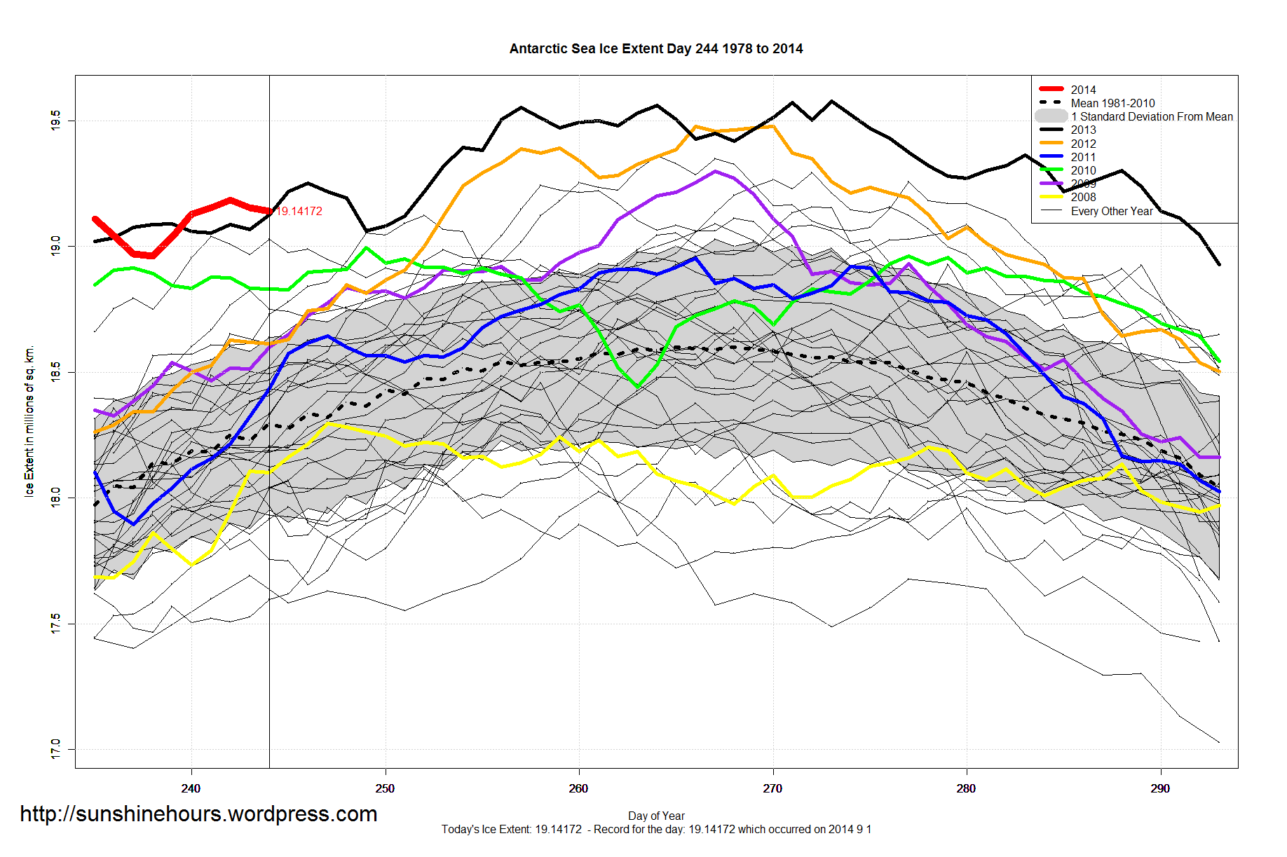 Antarctic Sea Ice Extent Sep 02 2014 – 846,000 sq km above the 1981-2010 mean. Data for Day 244. Data here.